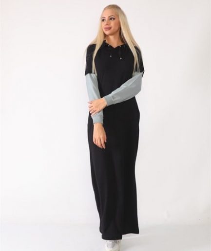 Повседневное длинное спортивное платье с полосками — черное, удобное, с капюшоном и двойными карманами, подходит для скромной одежды