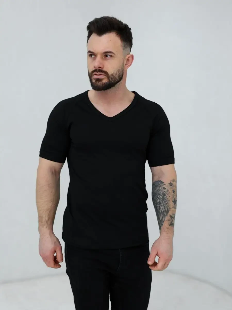 Базовая футболка Berrak черного цвета с коротким рукавом и V-образным вырезом. Приталенная, плотно прилегает к фигуре. Футболка изготовлена из 100% хлопка.