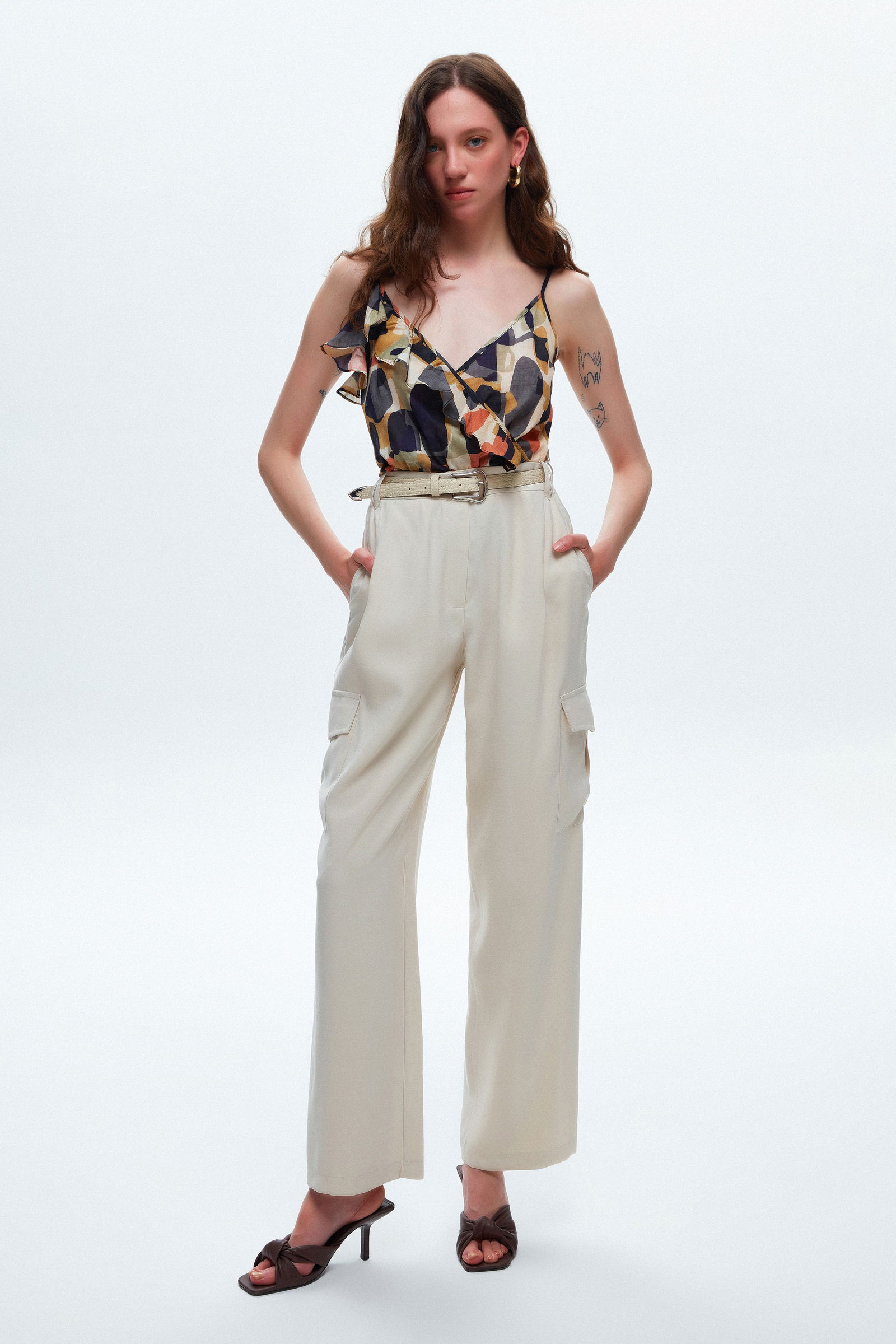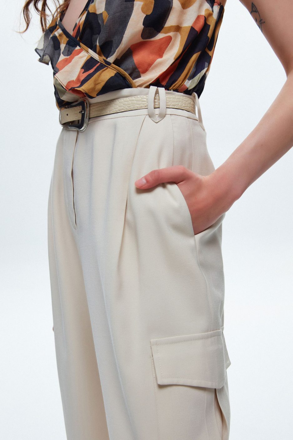 Бежевые широкие брюки с карманами и поясом MAVI, размер XXL, ткань ECOVERO, машина холодная стирка 30°C, низкая температура глажения