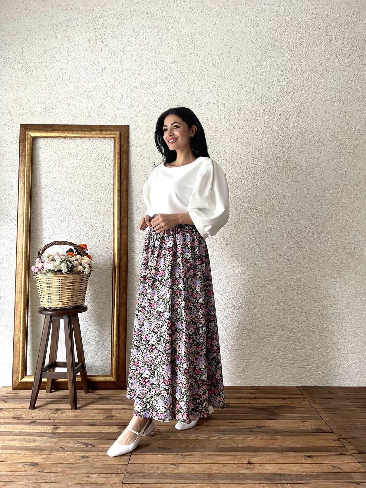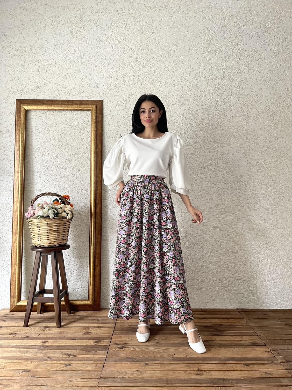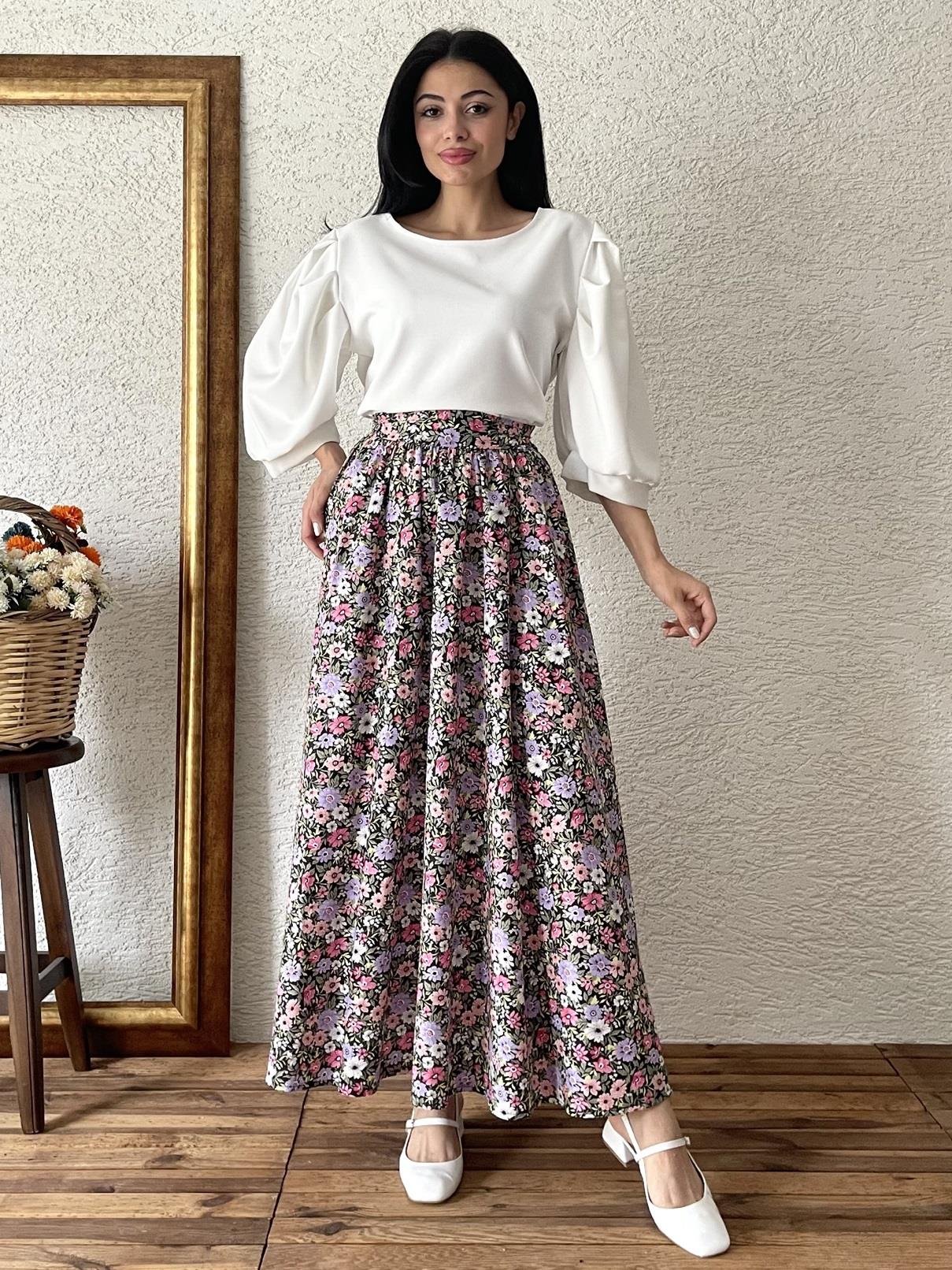 Черная и фиолетовая юбка с цветочным принтом из поплина, узкая, длина 95 см, размеры 1 (36-38) и 2 (40-42), стирать вручную в холодной воде