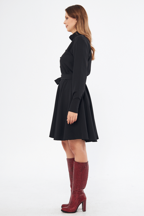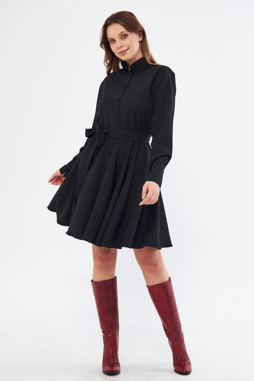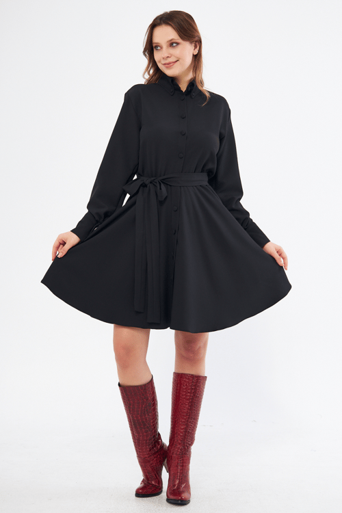 Черное длиннополое платье-рубашка с поясом и длинным рукавом, без подкладки, для стиля и комфорта, доступно в нескольких размерах