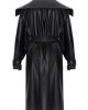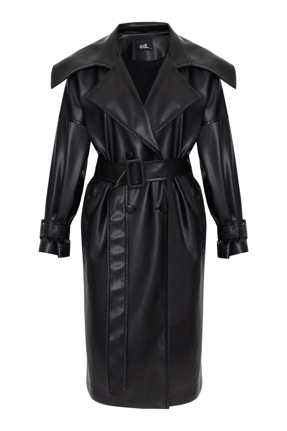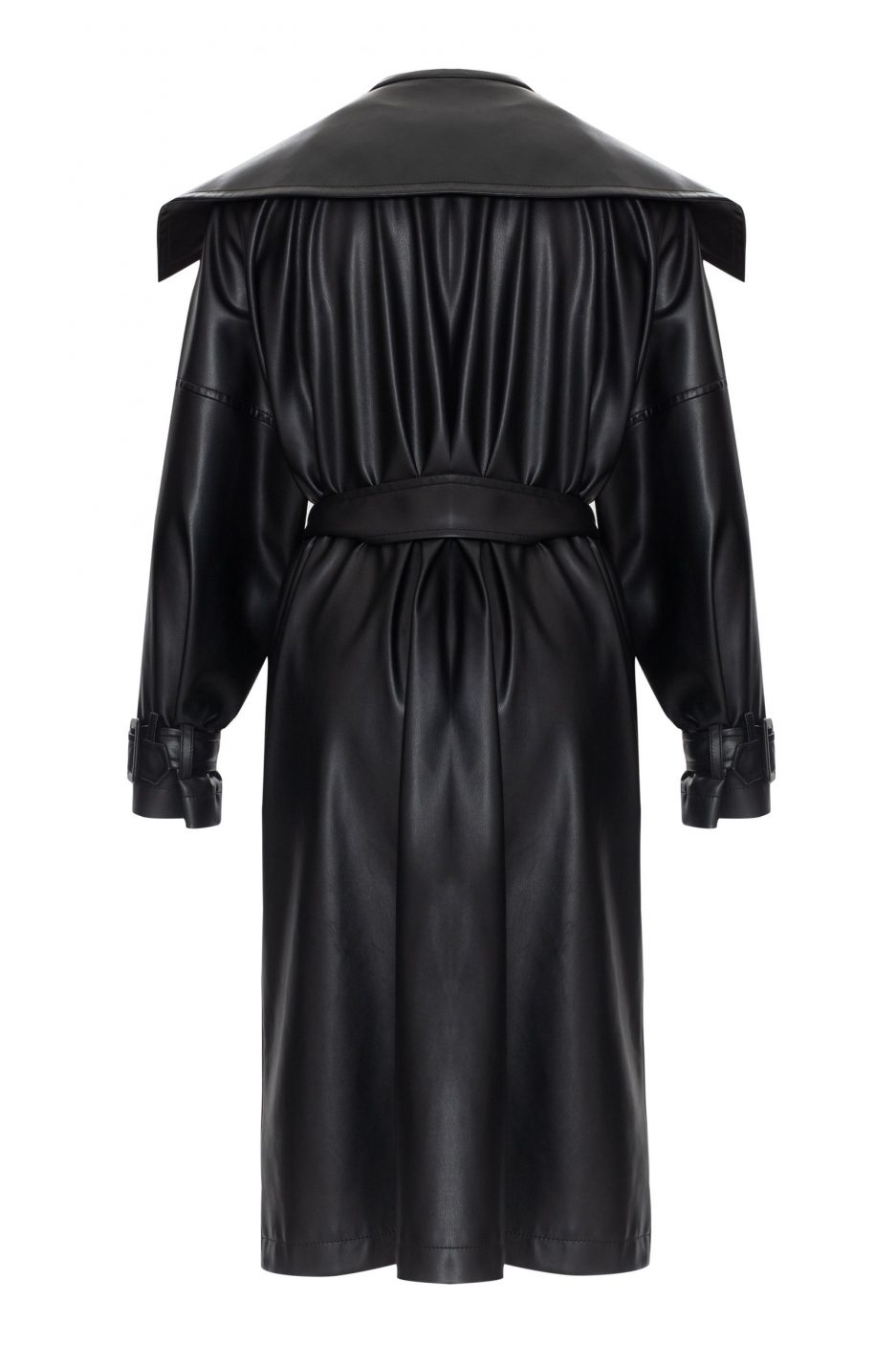 Черное кожаное тренчкот с поясом и карманами, состав: 97% ПВХ, 3% полиуретан, размер XL, стильный офисный вариант