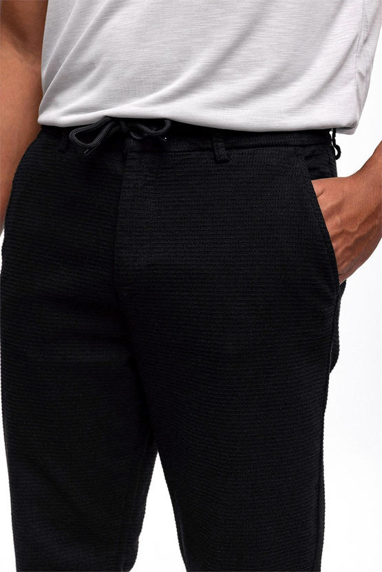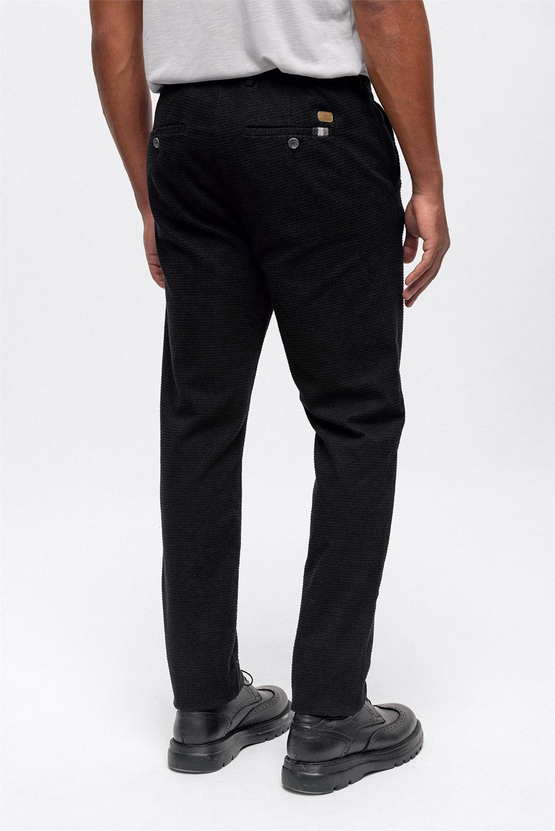 Черные смарт фит чинос с составом 46% хлопка, 33% полиэстера, 18% вискозы, 3% эластана, для размеров 40-50, местное производство