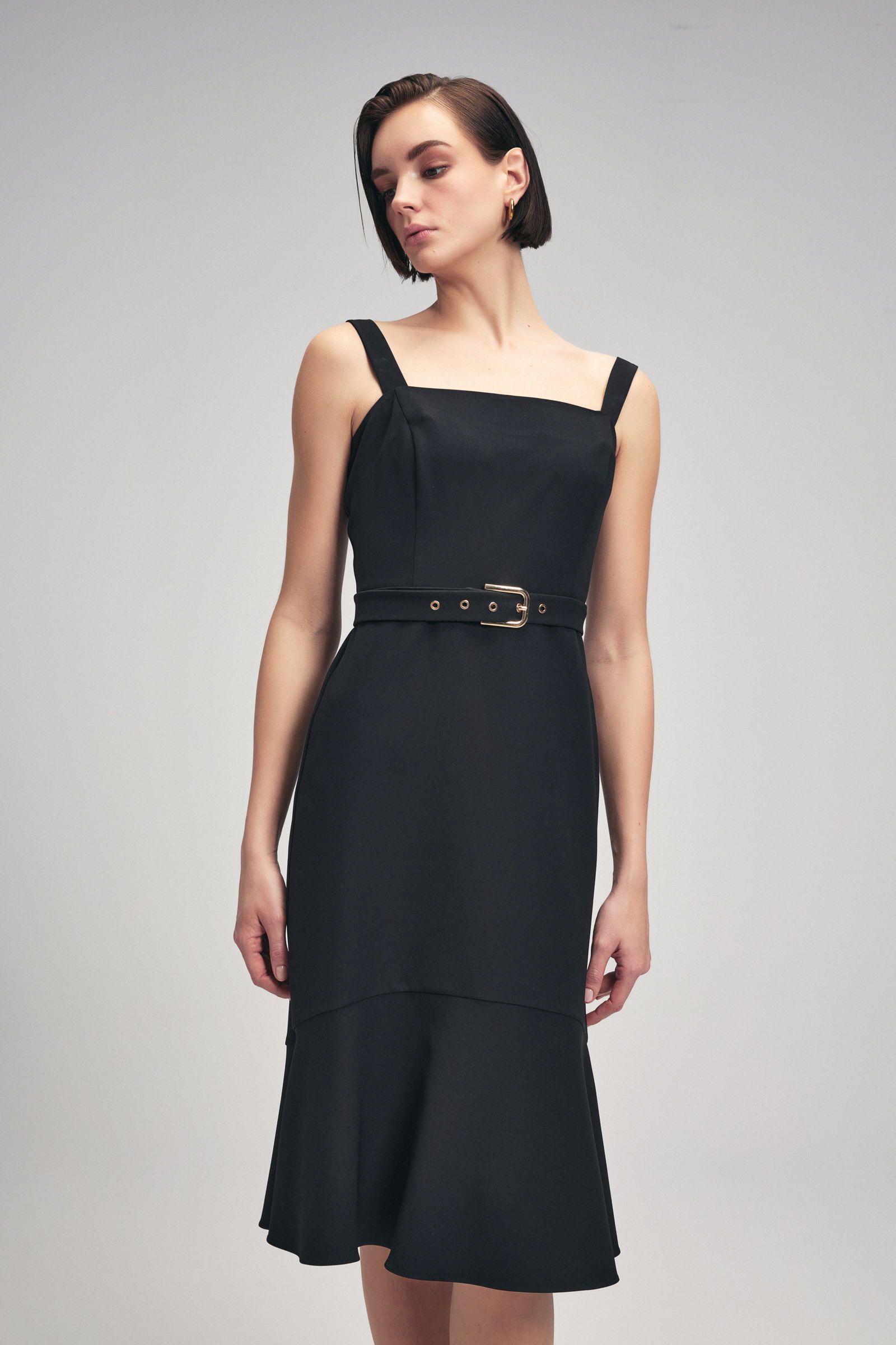 Чёрное платье с воланами, с поясом, без рукавов, с застёжкой на молнии, бизнес-стиль, 52% переработанный полиэстер, размер XS