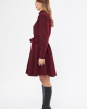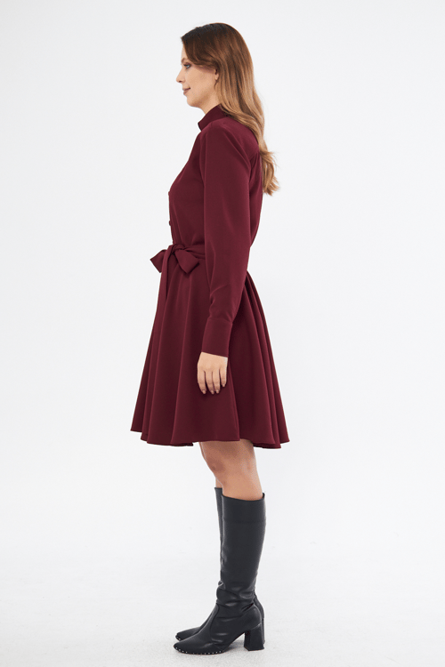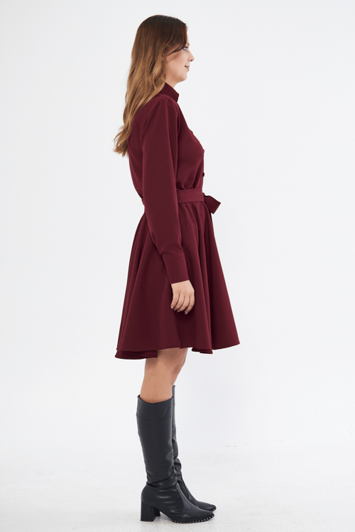 Длинное платье-рубашка с поясом, бордо, ткань с узором, размеры 34-54, длина 95 см, стеганые плечи, кнопки спереди