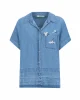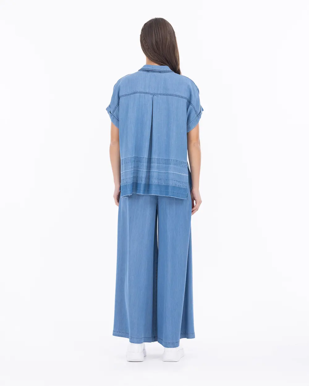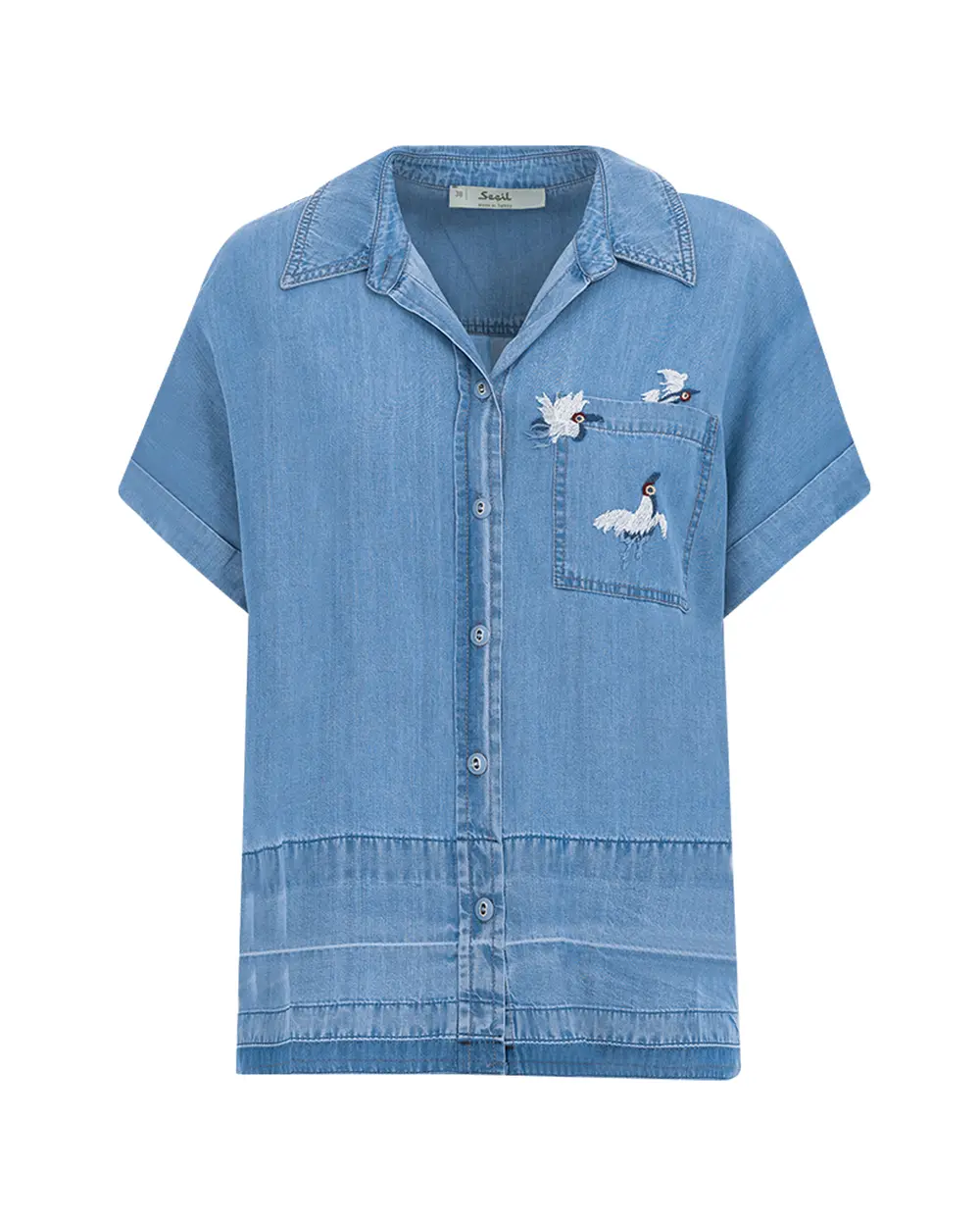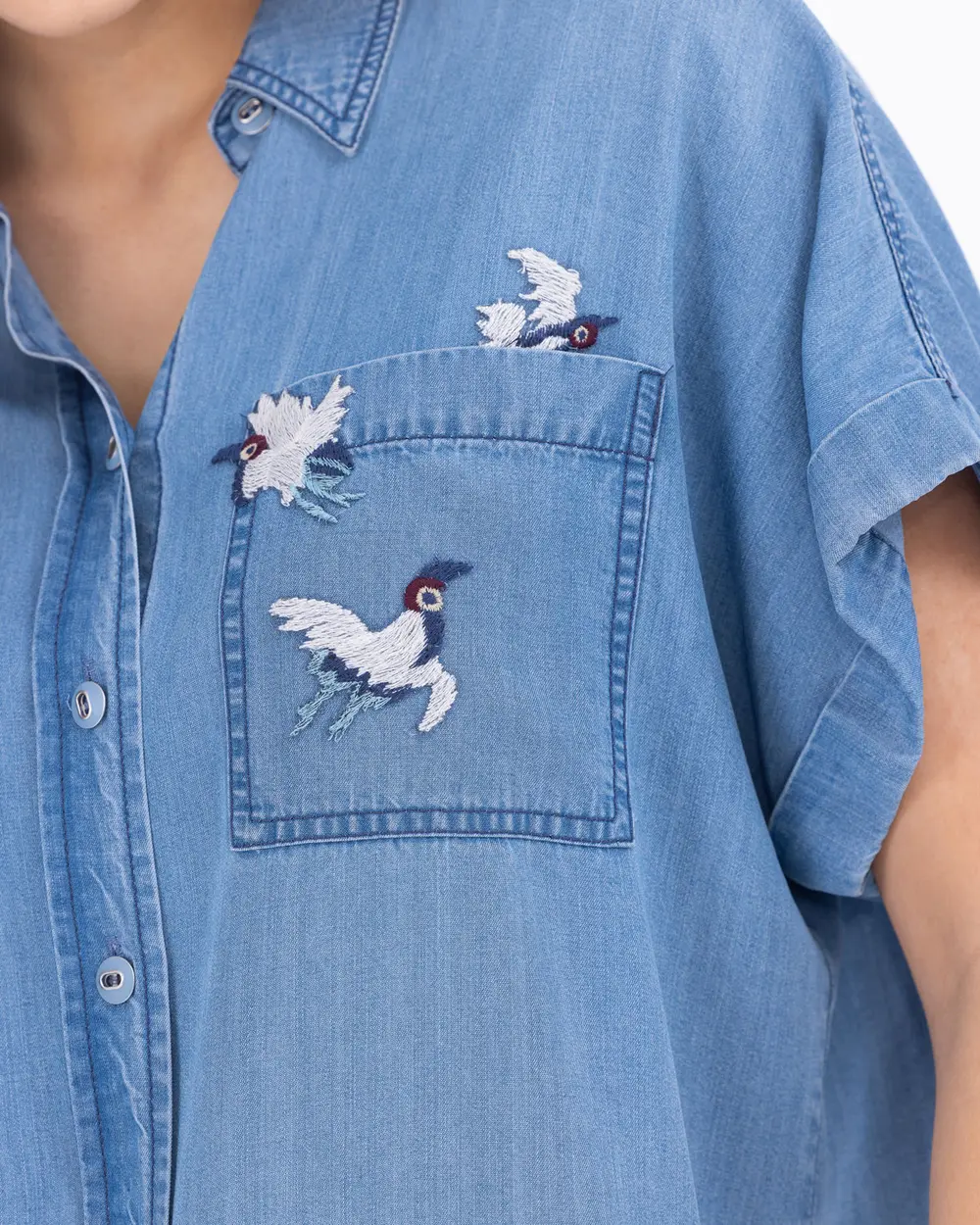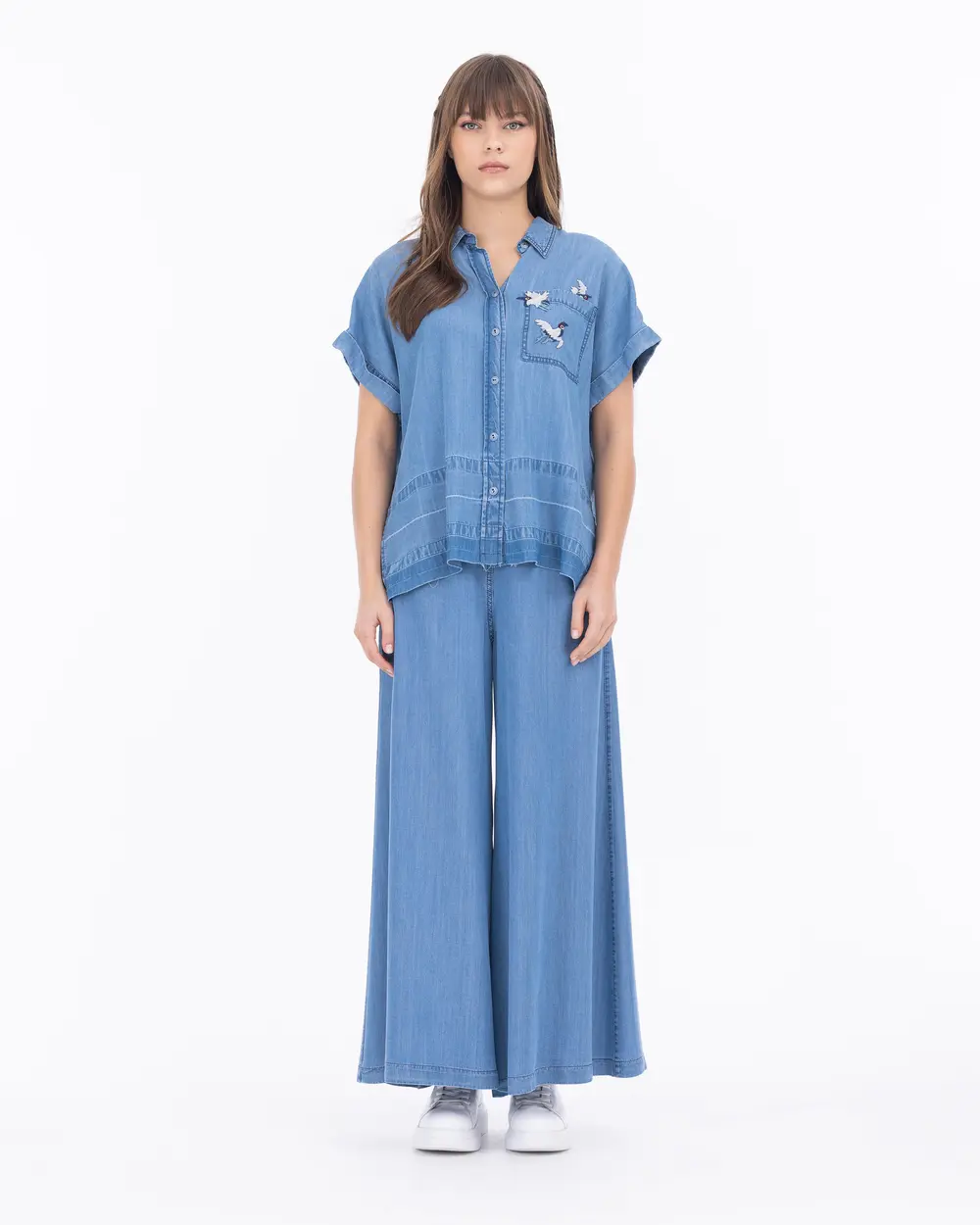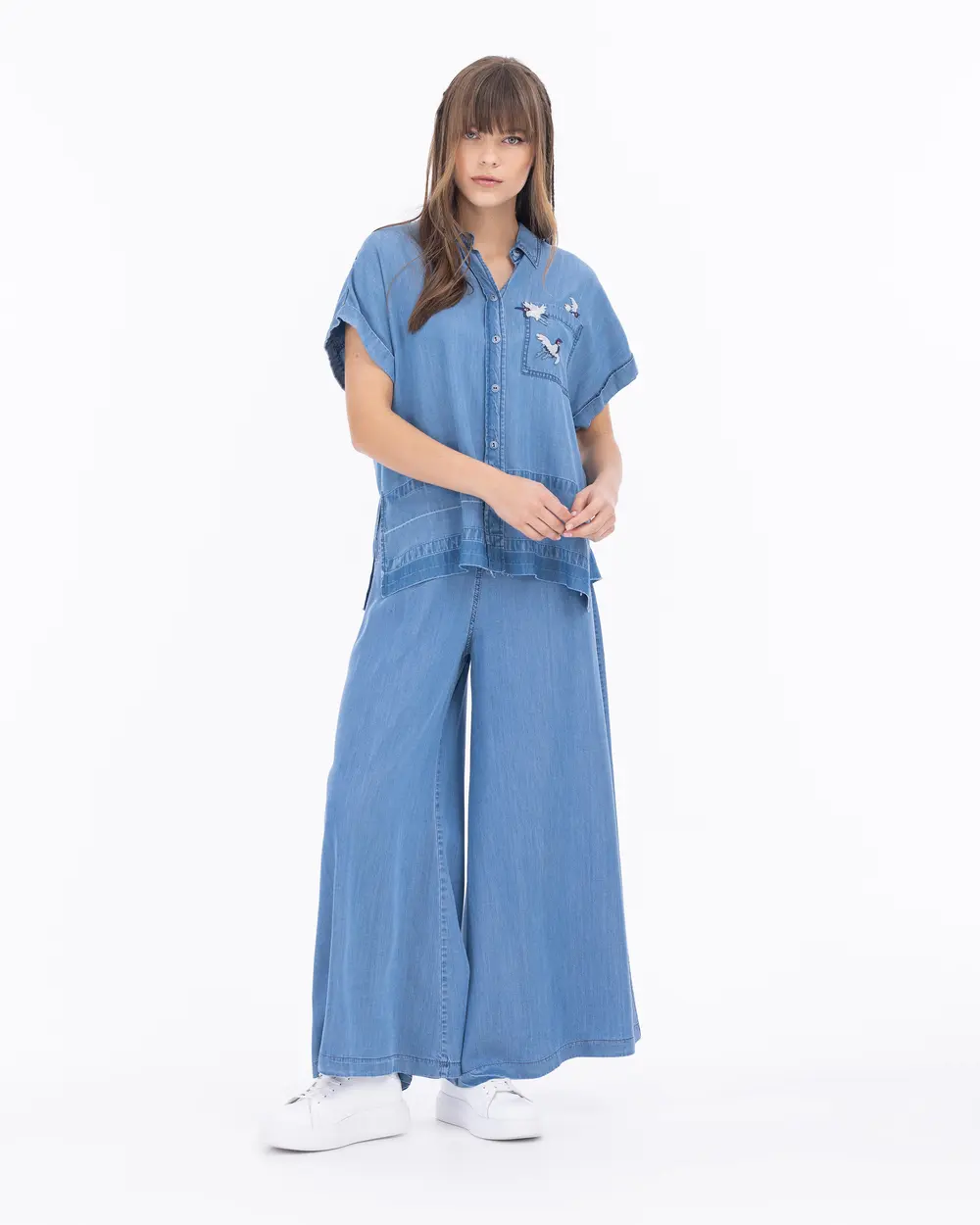 Джинсовая рубашка из тенсела с вышивкой, короткий рукав, комфортная, уникальный стиль, сочетайте с широкими брюками