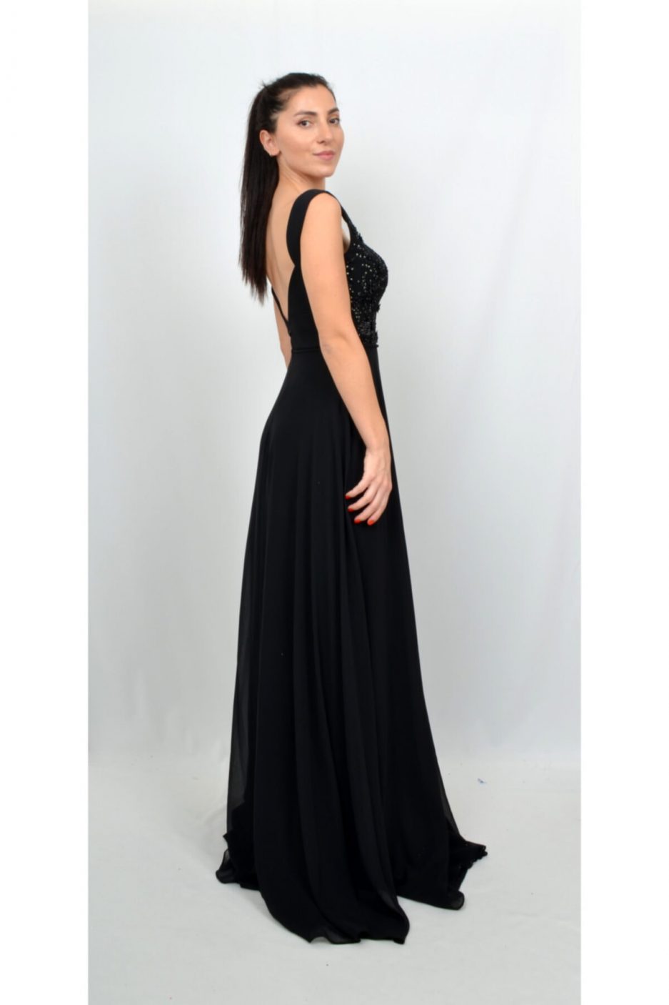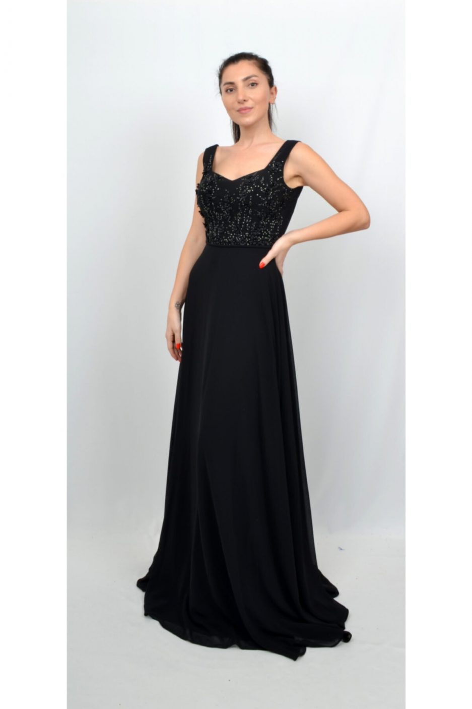 Элегантное черное вечернее платье с 3D цветочными аппликациями и камнями, размеры 36-40