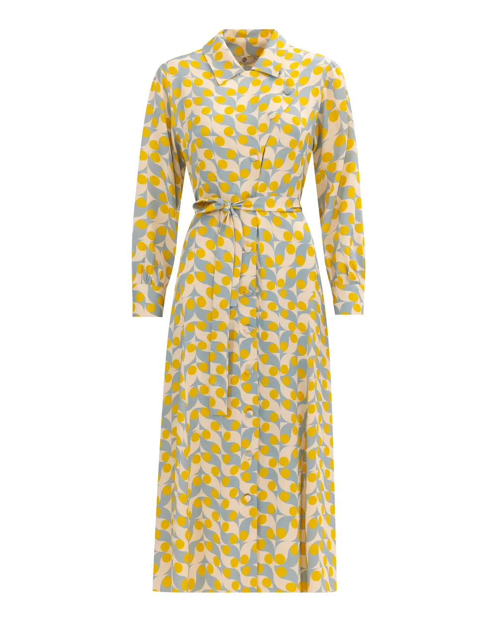 Элегантное платье с геометрическим узором, функциональными карманами и стильным поясом, идеально для повседневной и особых случаев