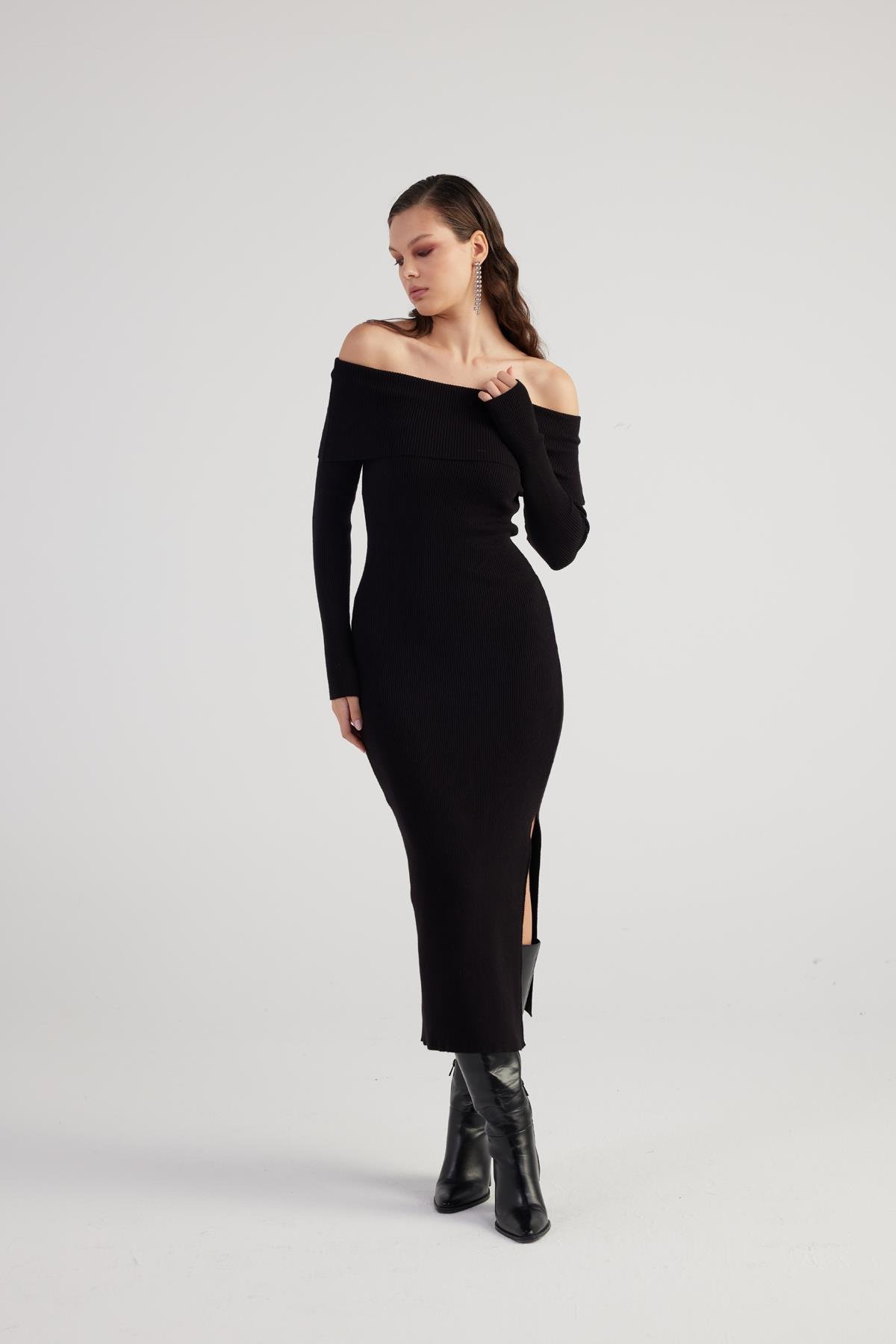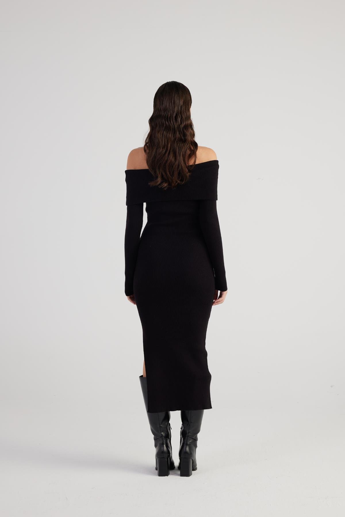 Элегантное трикотажное платье Tilda черного цвета с вырезом и миди длиной, мягкая текстура и стильный дизайн