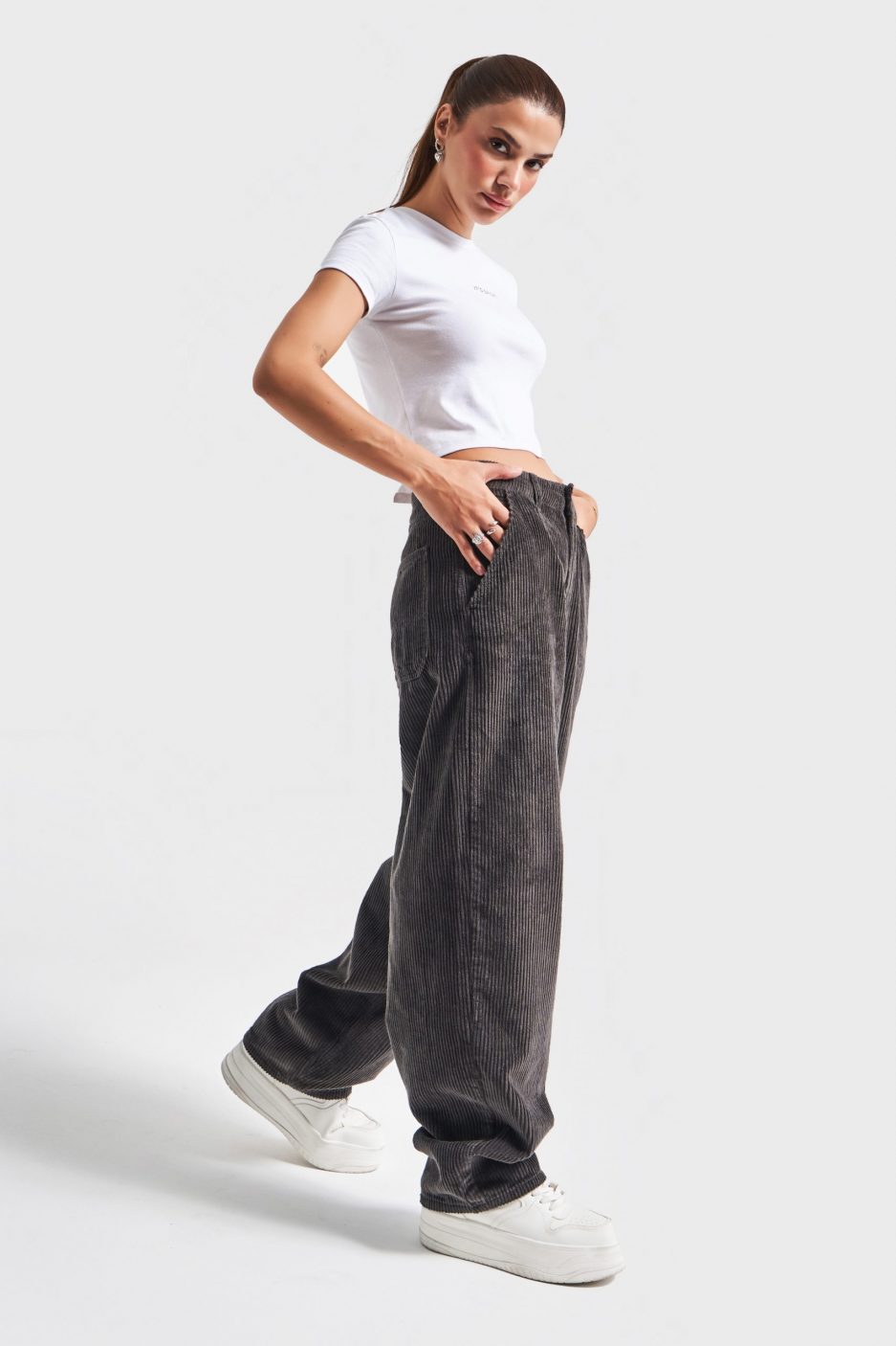 Рост модели составляет 173 см; Модель весит 56 кг; используется хлопчатобумажная ткань; Длина изделия — стандартный размер для всех размеров; антрацитовый цвет.; бархатные облегающие брюки
