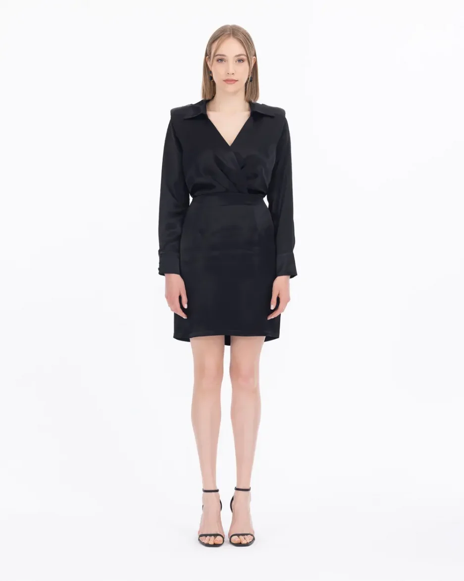 Коктейльное платье черного цвета с ваткой и крестовидным вырезом, длинный рукав, мини-длина, идеальная для стильного образа