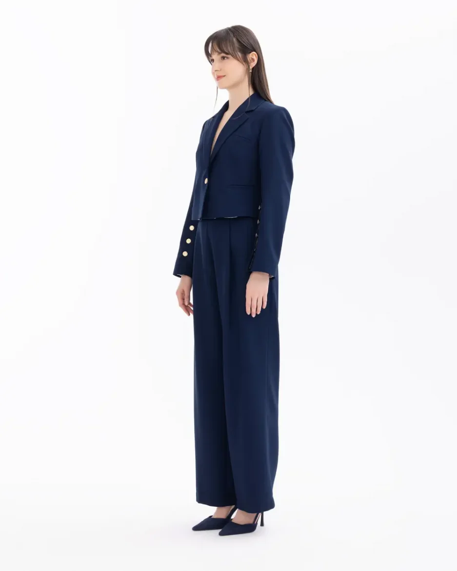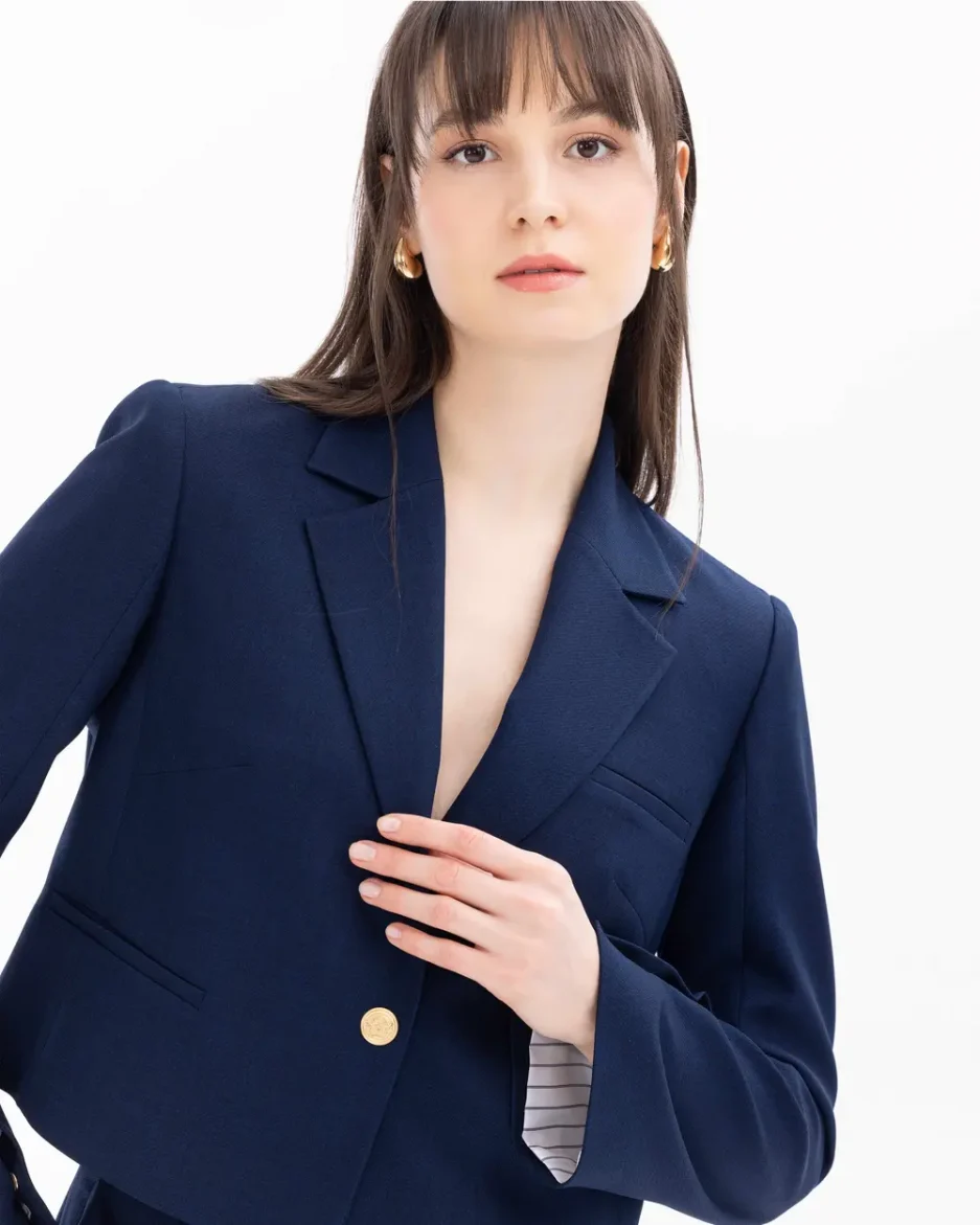 Короткий блейзер с пуговицами на талии, современный стиль, универсален для повседневной и торжественной носки, доступен в темно-синем цвете