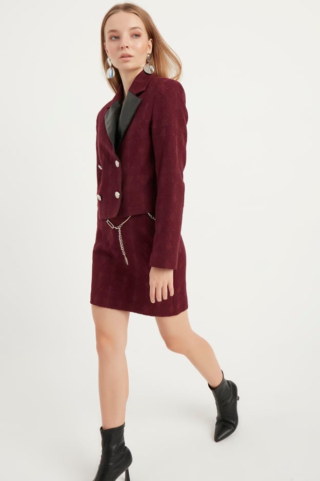 Короткий жакет с бордовыми кожаными деталями и жаккардовой текстурой 100% хлопок, размеры 36-42
