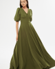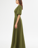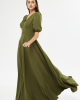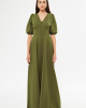 Макси-платье хаки с вышивкой, баллонными рукавами и запахом, декорированное пуговками и сборкой на груди, из хлопково-полиэстеровой ткани