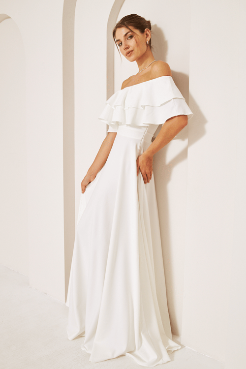 Макси платье с низкими плечами и двойной оборкой, модель для выпускного — белое, размеры 34-54