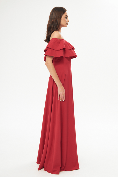 Макси-платье с оборками, открытыми плечами и корсажем, красное, размеры 34-54, для выпускного и торжеств, хлопок-полиэстер-лайкра
