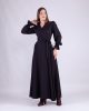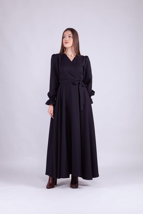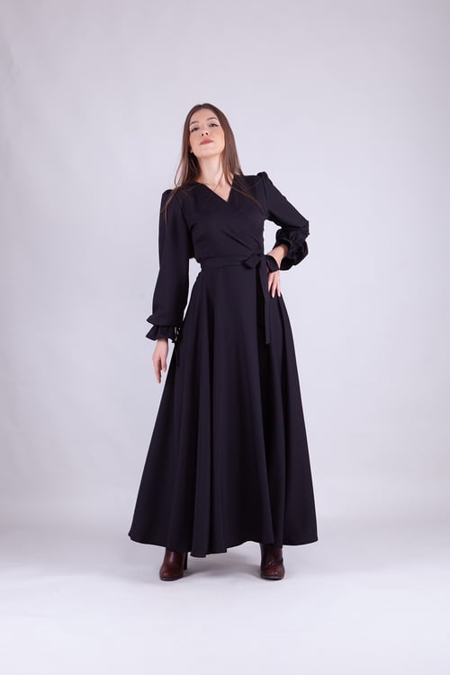 Макси платье с перекрестным вырезом и длинными рукавами, черное, размеры 34(XS)-54(7XL), материал: хлопок-полиэстер-лайкра, скрытая молния