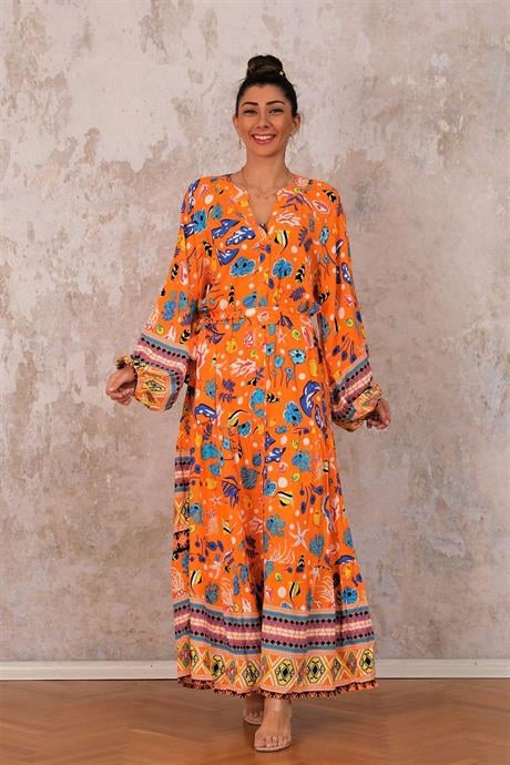 Маркано оранжевое платье с пуговицами, баллонными рукавами, поясом и двойным слоем, длина 140 см, 100% вискоза, различные размеры
