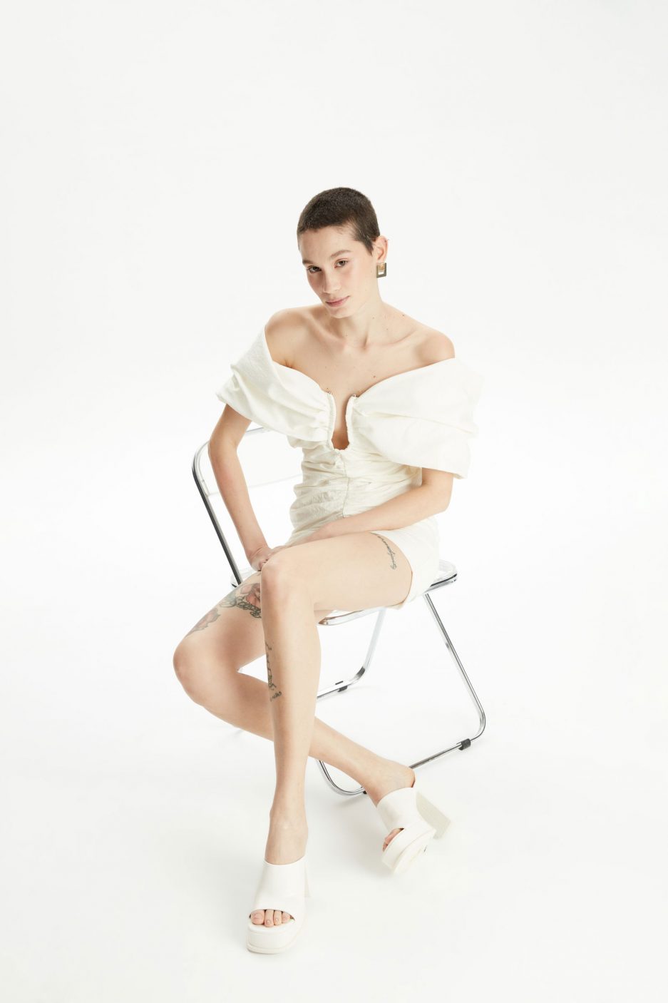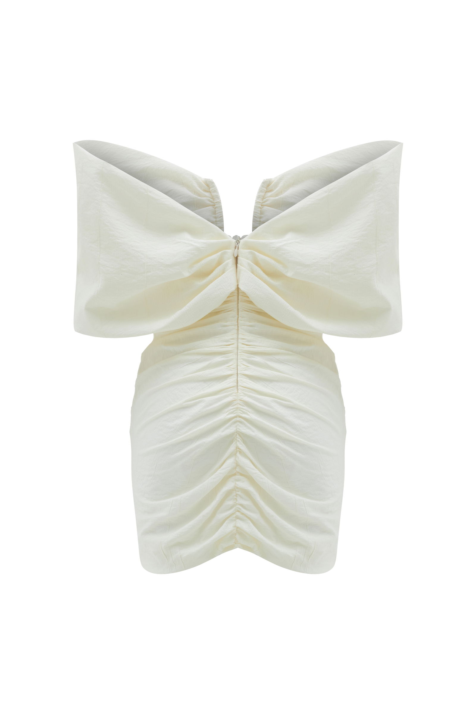 Мини-платье белого цвета с открытыми плечами от бренда ADL, размер M, 84% вискозы и 16% полиамида, машинная стирка, бережная глажка