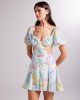 Мини-платье с цветочным узором, balloon рукав, голубого цвета, размер XS