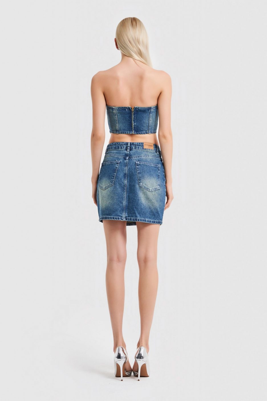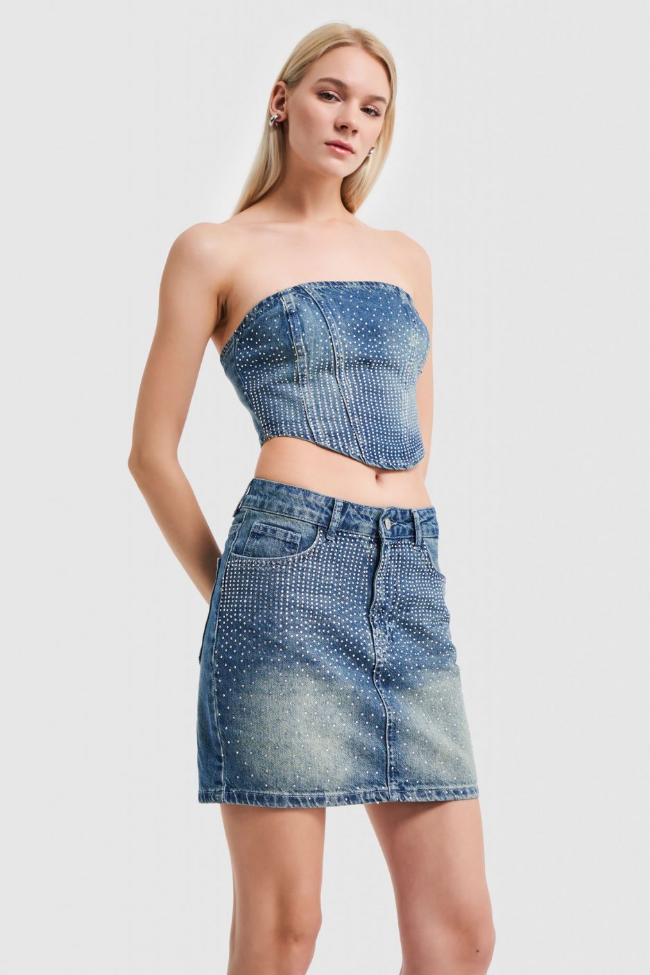 Мини юбка из джинсовой ткани с блестящими камнями, цвет: каменный, размер: 34/36