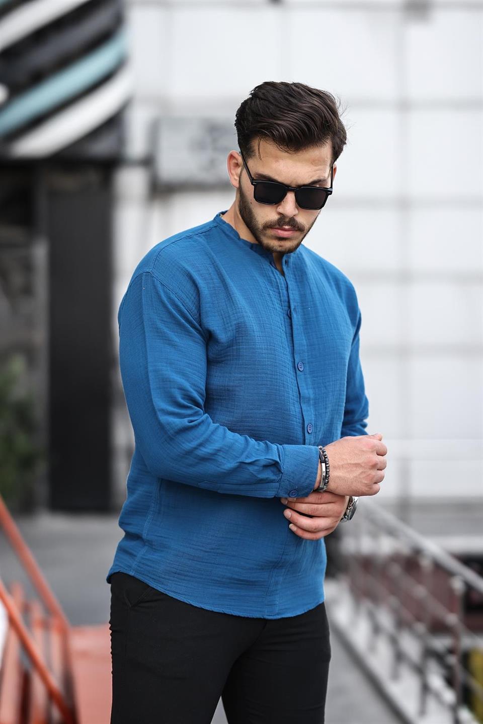 Мужская оверсайз рубашка из муслина с полузастежкой и воротником-стойкой, цвет индиго, идеально подходит для повседневного и формального стиля