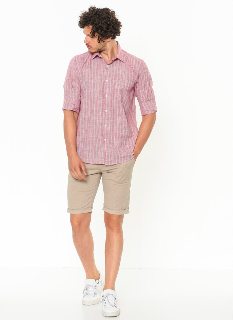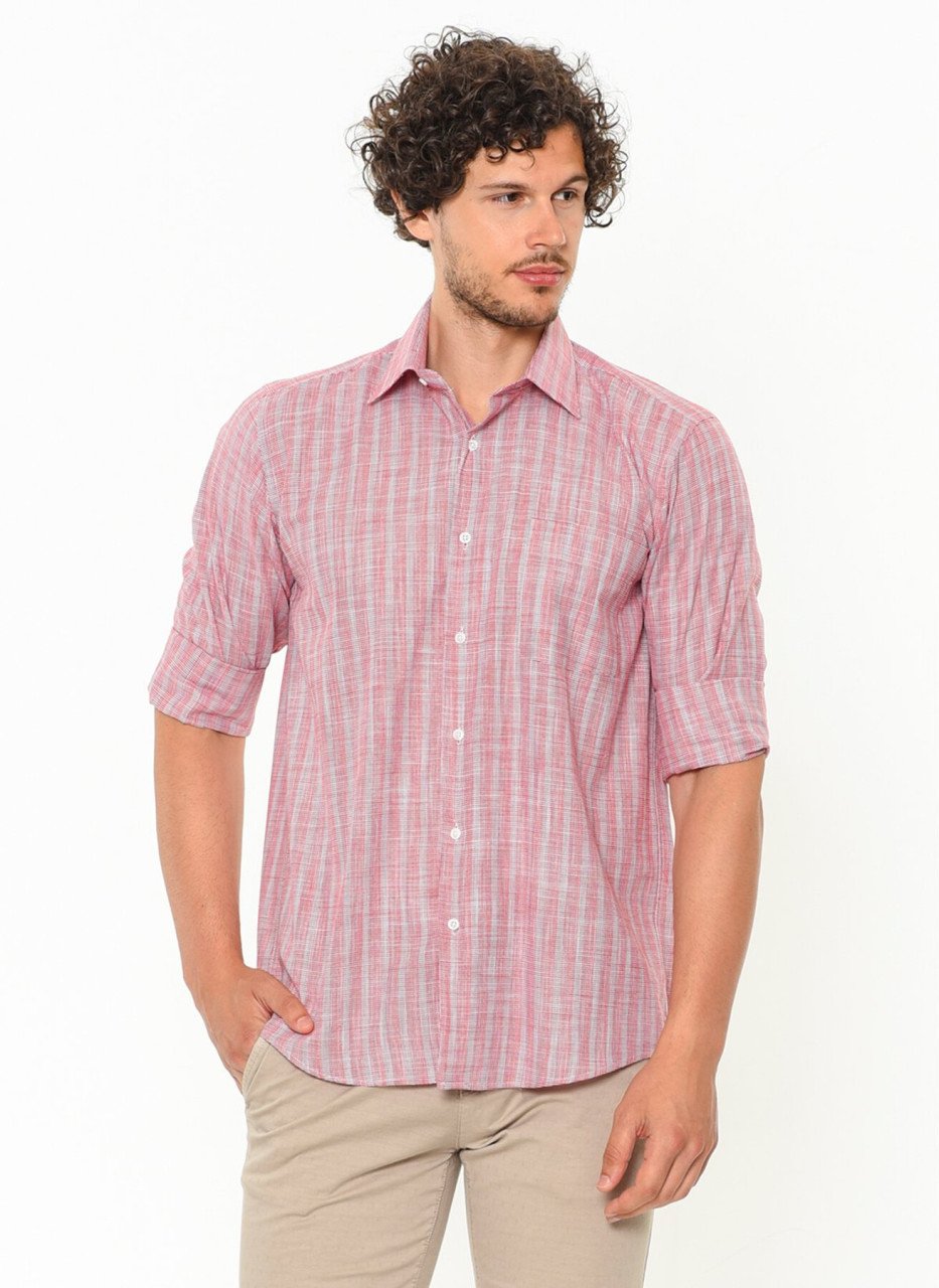 Мужская розовая клетчатая классическая рубашка с длинным рукавом и одним карманом из хлопка