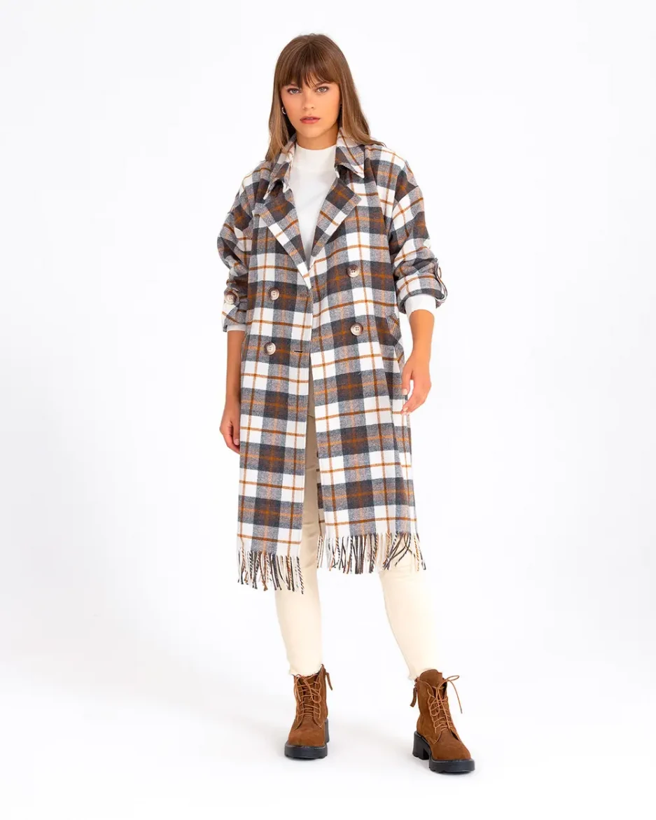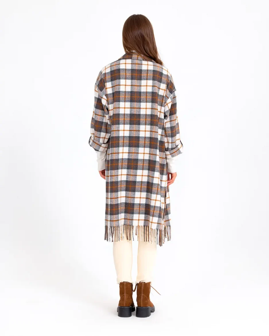 Оверсайз пальто в клетку с декоративными кисточками, длинным рукавом, без подкладки, из акрила и полиэстера, цвета коричневый и серый