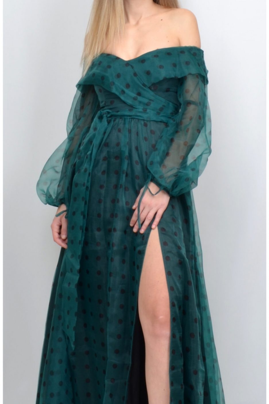 Платье ALİS с горошком, зелёное, с заниженными плечами и разрезом, модель 38, для особых случаев, узкий крой, заказывайте размер на один больше
