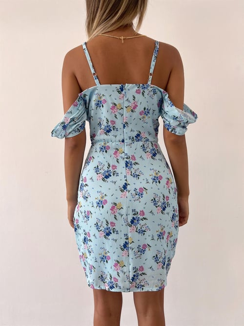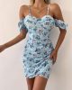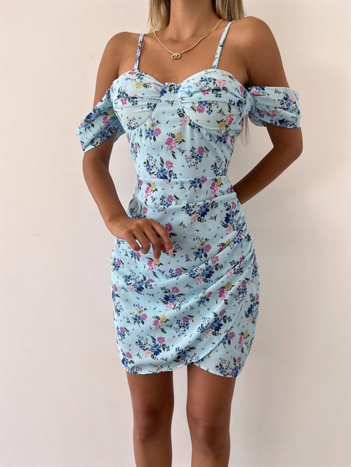 Платье голубое с цветочным узором и открытыми плечами, мини-длина, регулируемые тонкие бретели, драпировка спереди, кружевной задний замок