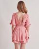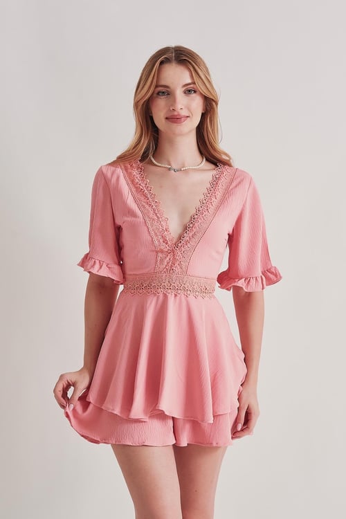 Платье-комбинезон нежно-розового цвета с декольте на спине и вышитыми деталями, длина 80 см, идеальная посадка, доступно в размерах S и M