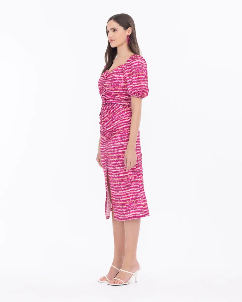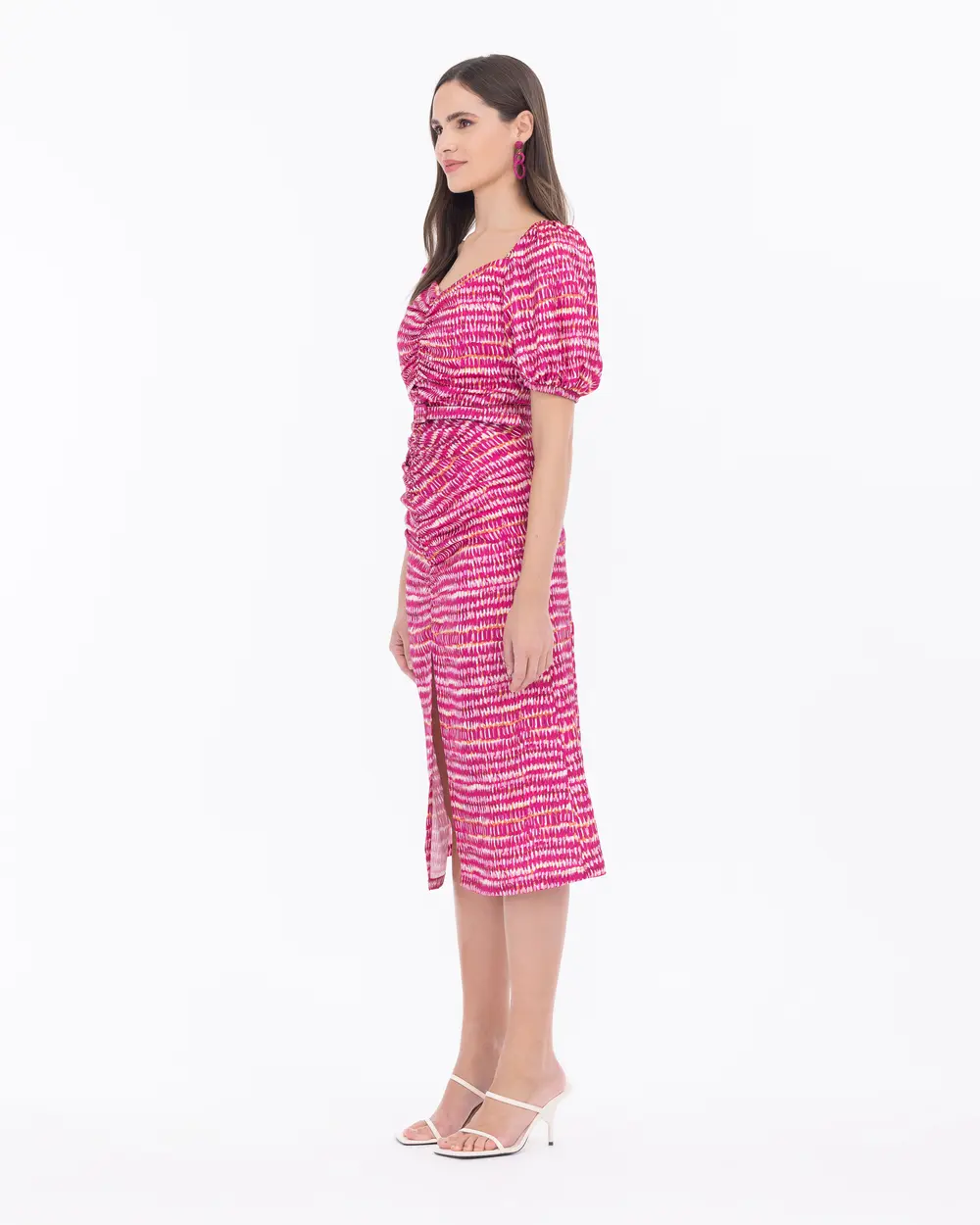 Платье миди с разрезами и драпировкой, воздушные рукава, пояс для двух стилей, 100% полиэстер, цвет: фуксия, размер 42