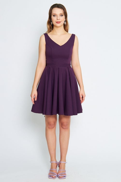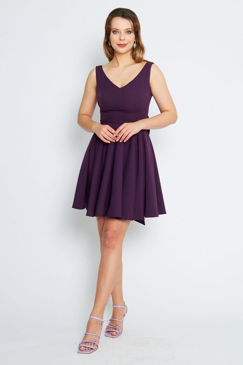 Платье мини-клош с V-образным вырезом, оборкой сзади, украшением в виде банта и пуговицами, цвет: фиолетовый, материалы: хлопок-полиэстер-лайкра