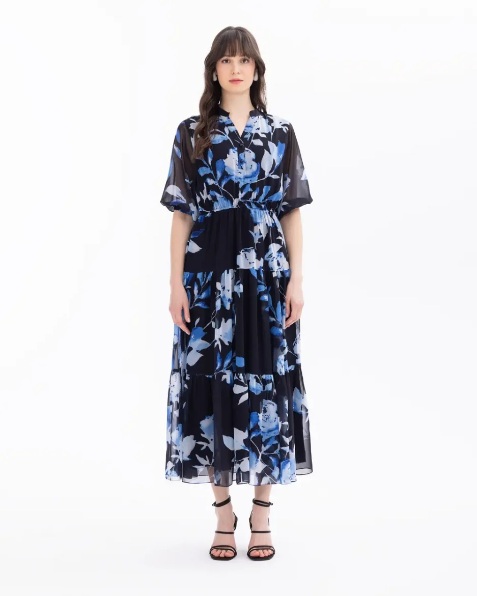 Платье с цветочным узором, V-образным вырезом и буферными рукавами, идеально для повседневного и особого события, 100% полиэстер