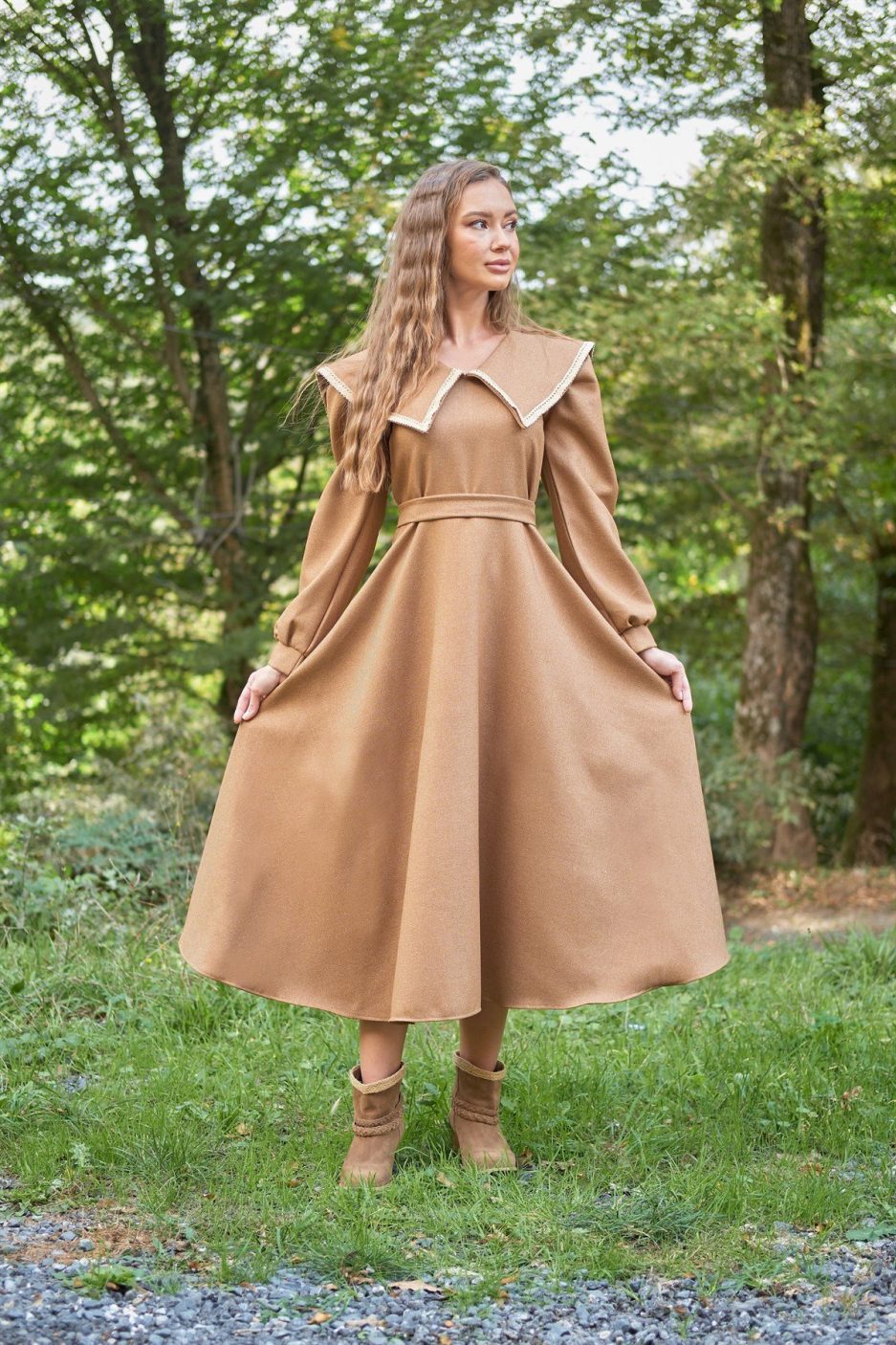Платье с винтажным воротником цвета табака из шероховатой ткани с поясом и эффектом шерсти, размеры от 36 до 46