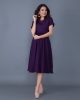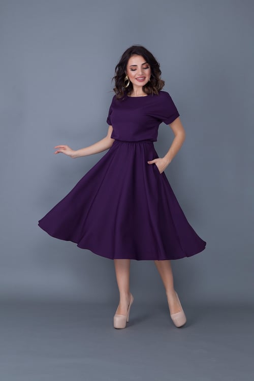 Платье средней длины с эластичным поясом, короткий рукав, цвет: фиолетовый, доступные размеры: XS-7XL, ткань: хлопок-полистер-эластан