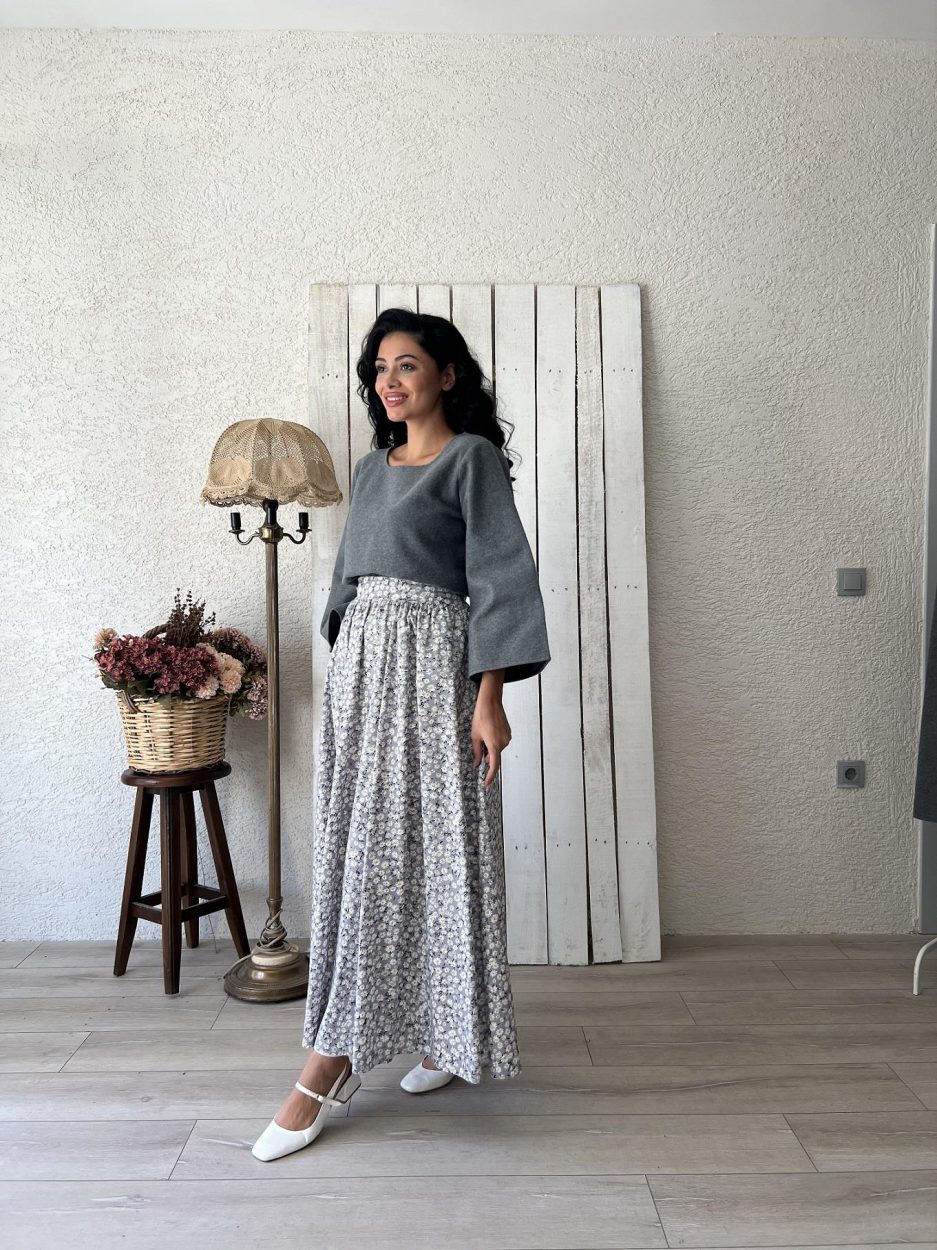 Серая юбка с ромашками в стиле клош, размер 36-42, длина 95 см, стирка при 30°, гладить при 150°, не использовать оптические отбеливатели