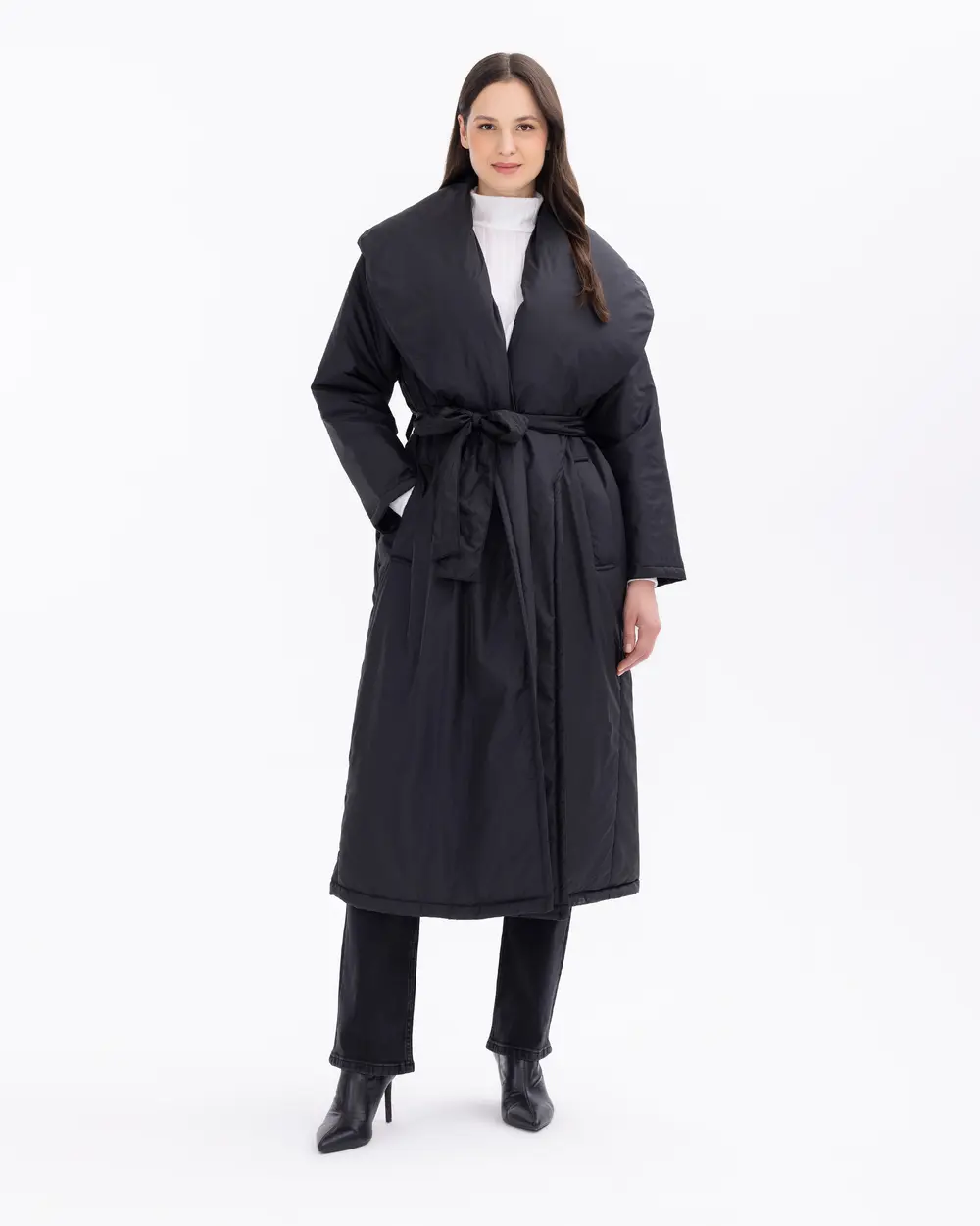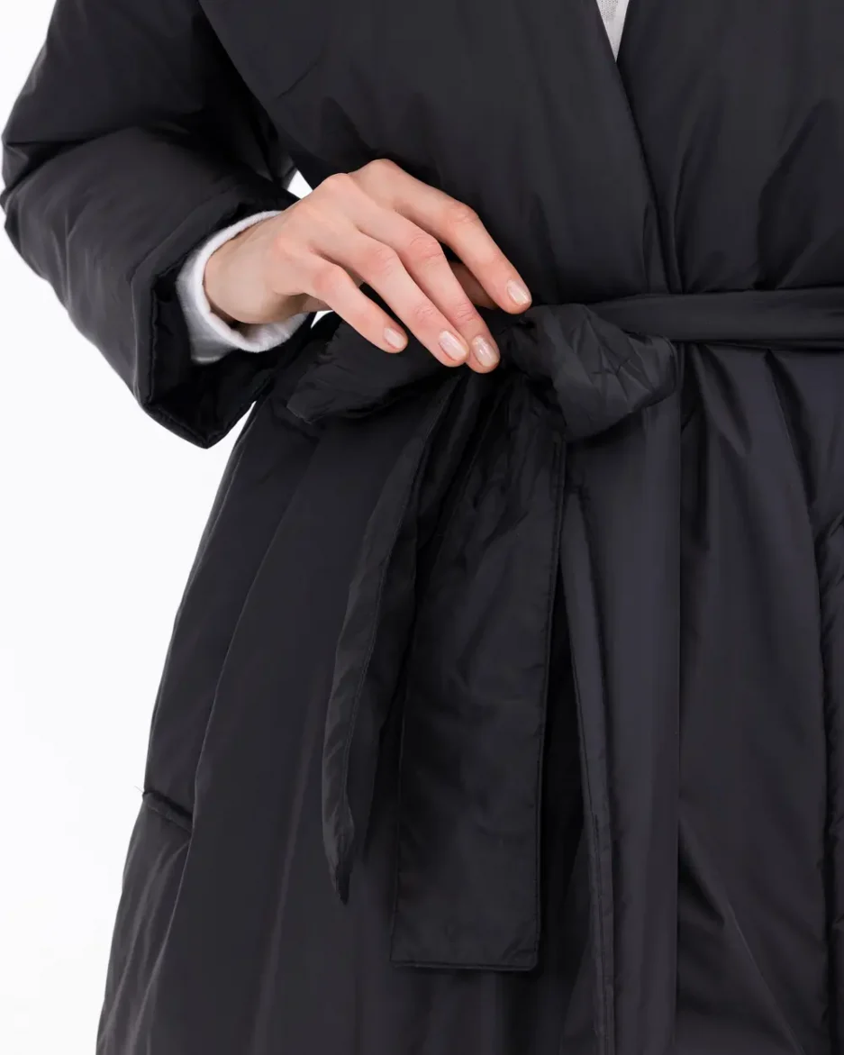 Шарфо: черное стеганое пальто средней длины с поясом и шалью на воротнике