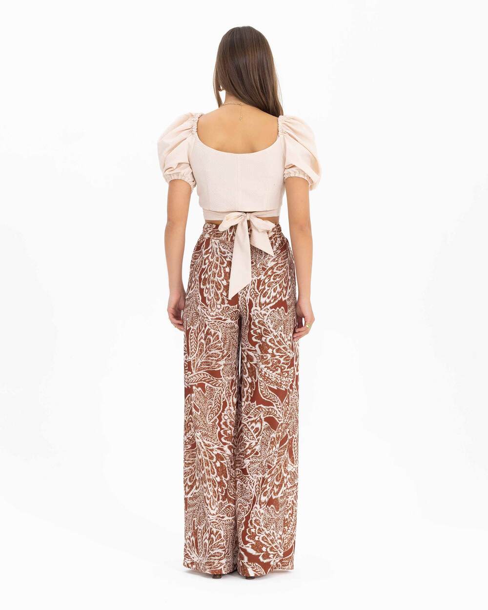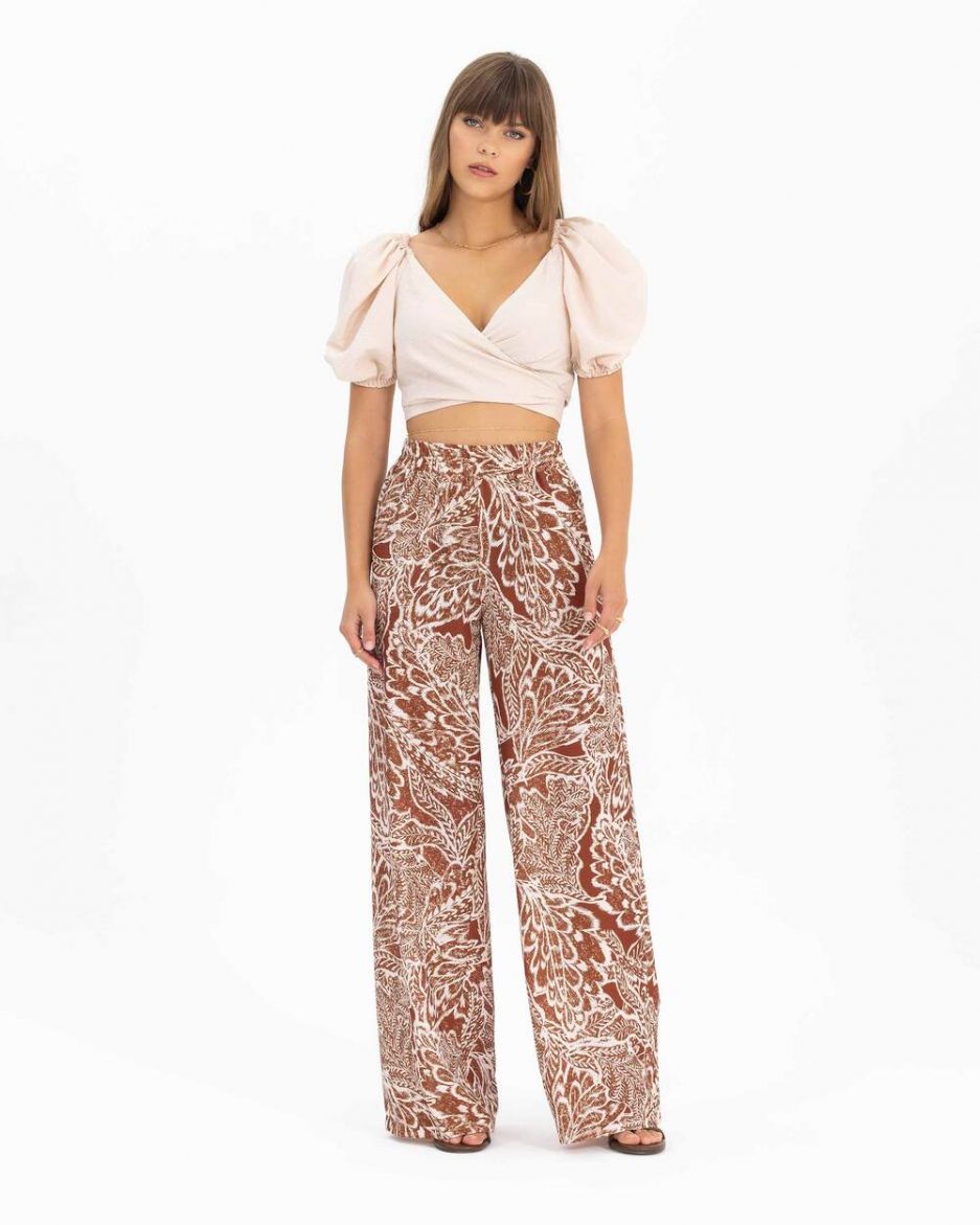 Широкие брюки с рисунком и эластичным поясом, 100% полиэстер, идеальны для стильных образов с топами. Размер 36, цвет коричневый