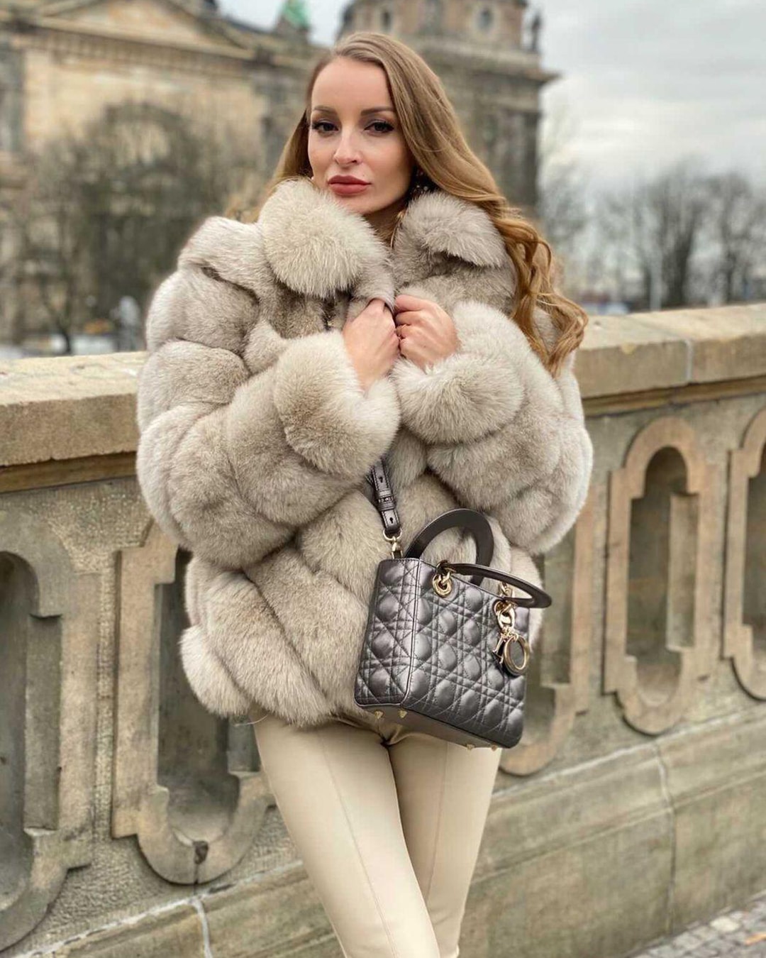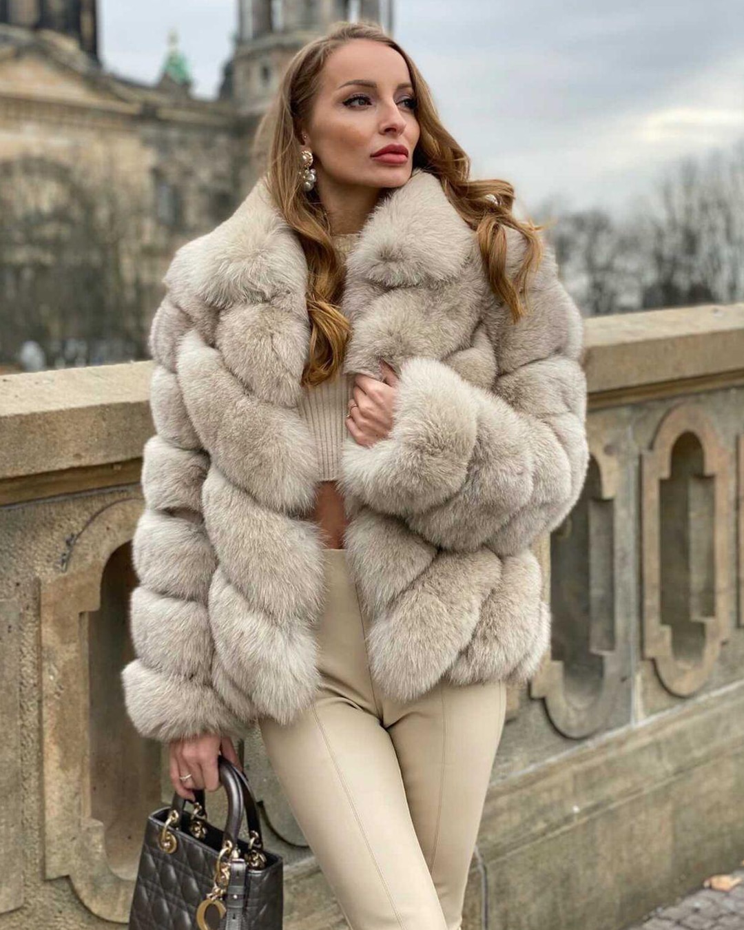 Шуба из лисьего меха с диагональными вставками ALISSA(телесный)