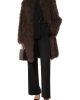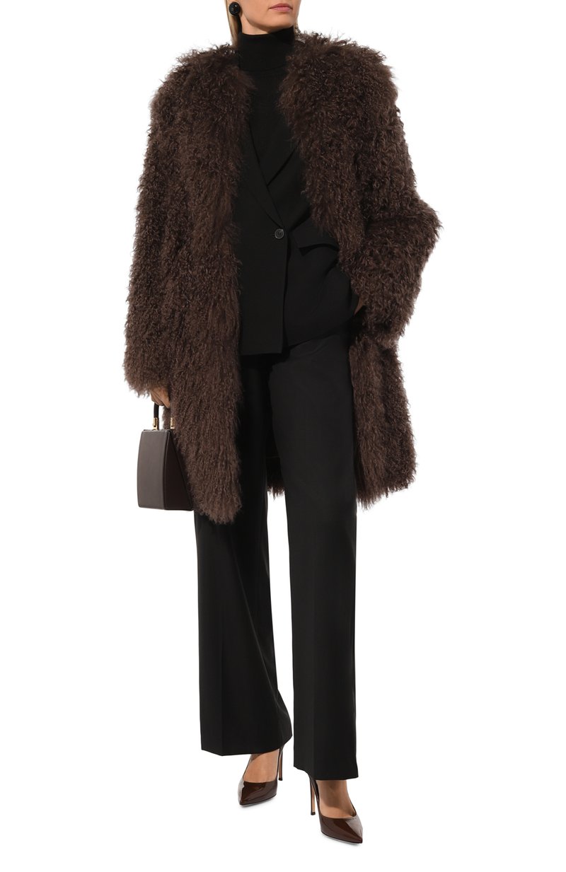 Объемную шубу с круглым вырезом сшили из овчины тиградо с длинными витым ворсом. Модель с боковыми карманами станет идеальным завершением элегантного образа.