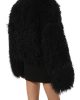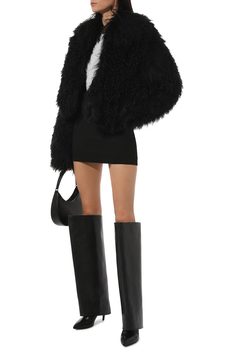 Каскад тонких волнистых прядей угольно-черного цвета наделил эту короткую шубу драматизмом. Команда бренда создала эффектную неровную фактуру, выбрав для пошива прямой модели редкую овчину из высокогорного Тибета. Суровый климат сделал мех овец не только особенно длинным, но и достаточно густым, чтобы в изделии было комфортно в холодные дни.