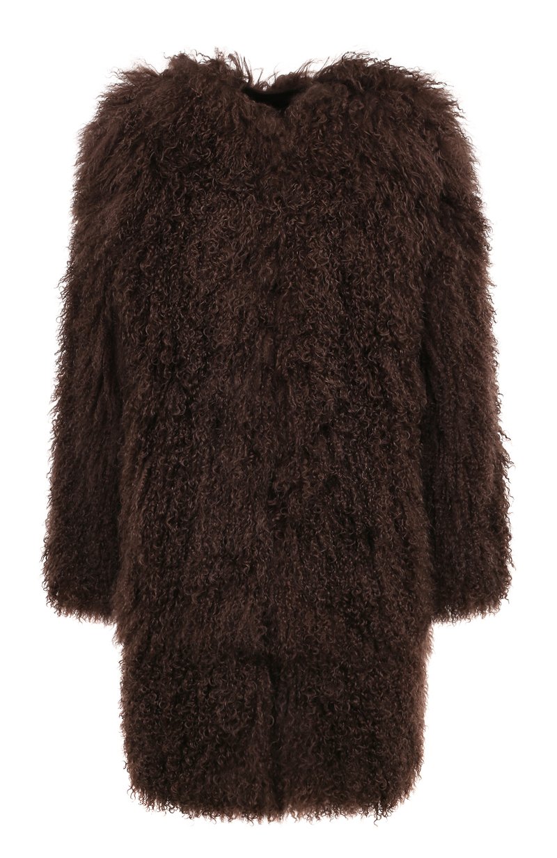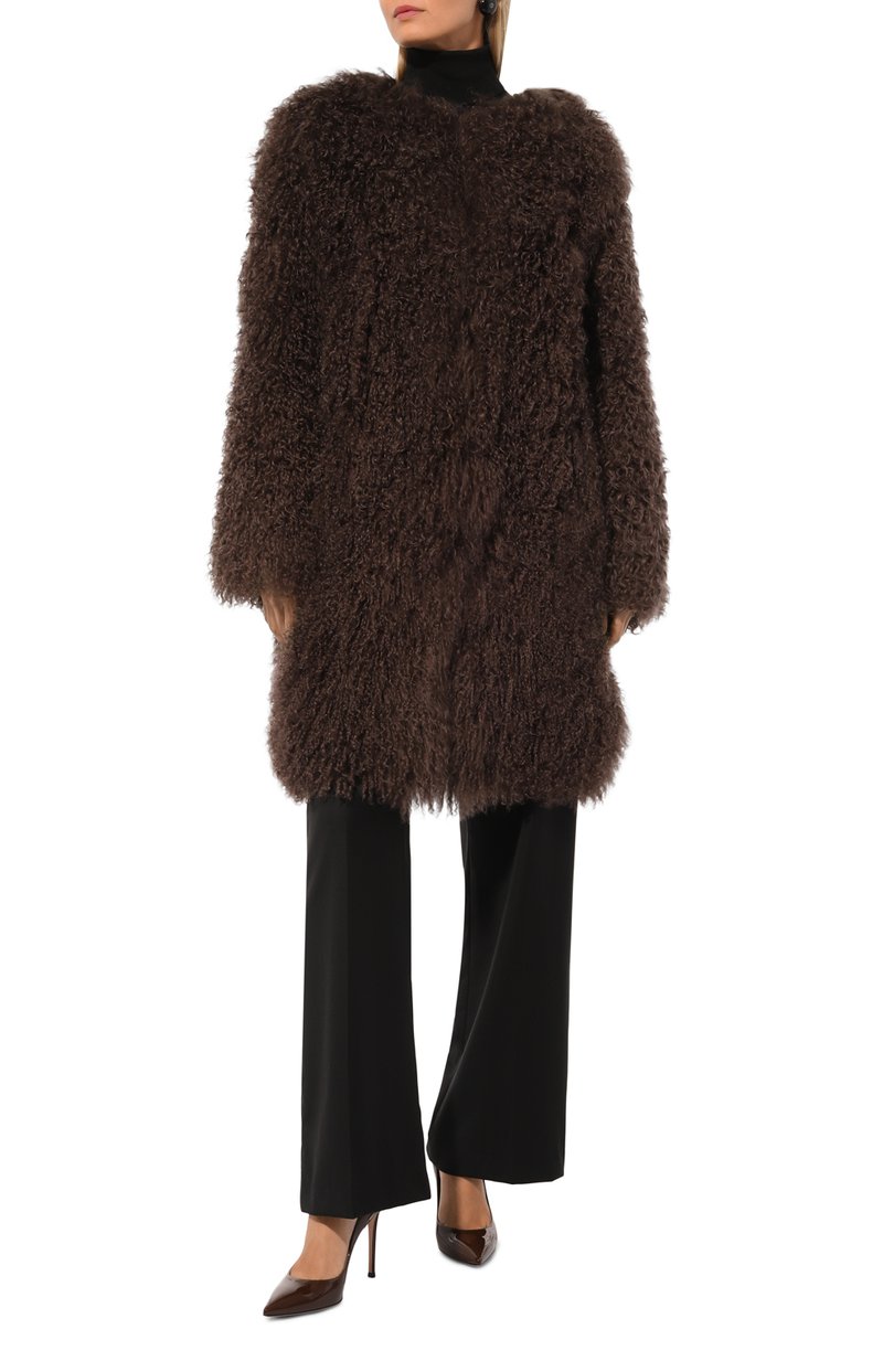 Объемную шубу с круглым вырезом сшили из овчины тиградо с длинными витым ворсом. Модель с боковыми карманами станет идеальным завершением элегантного образа.