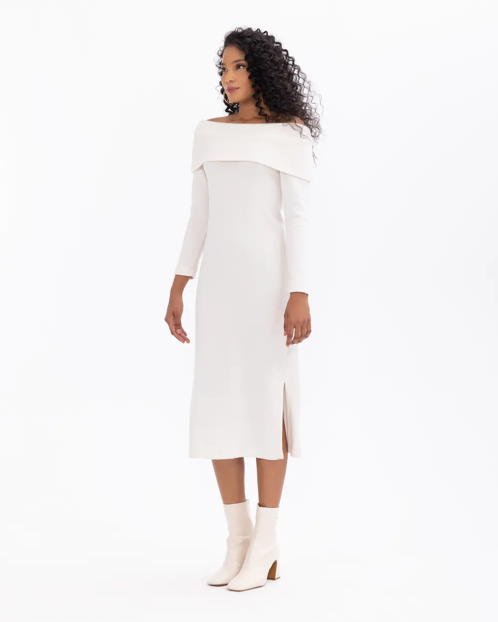 Утончённое приталенное миди-платье с обманным воротником, длинным рукавом и разрезом в цвете крема