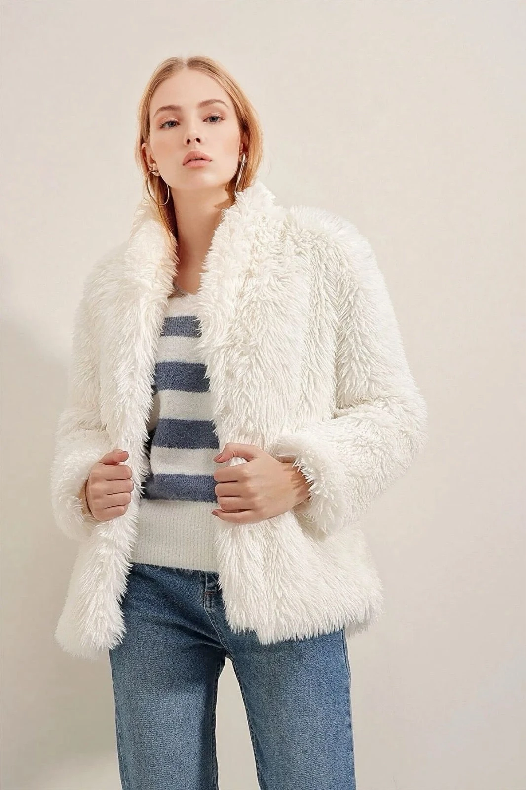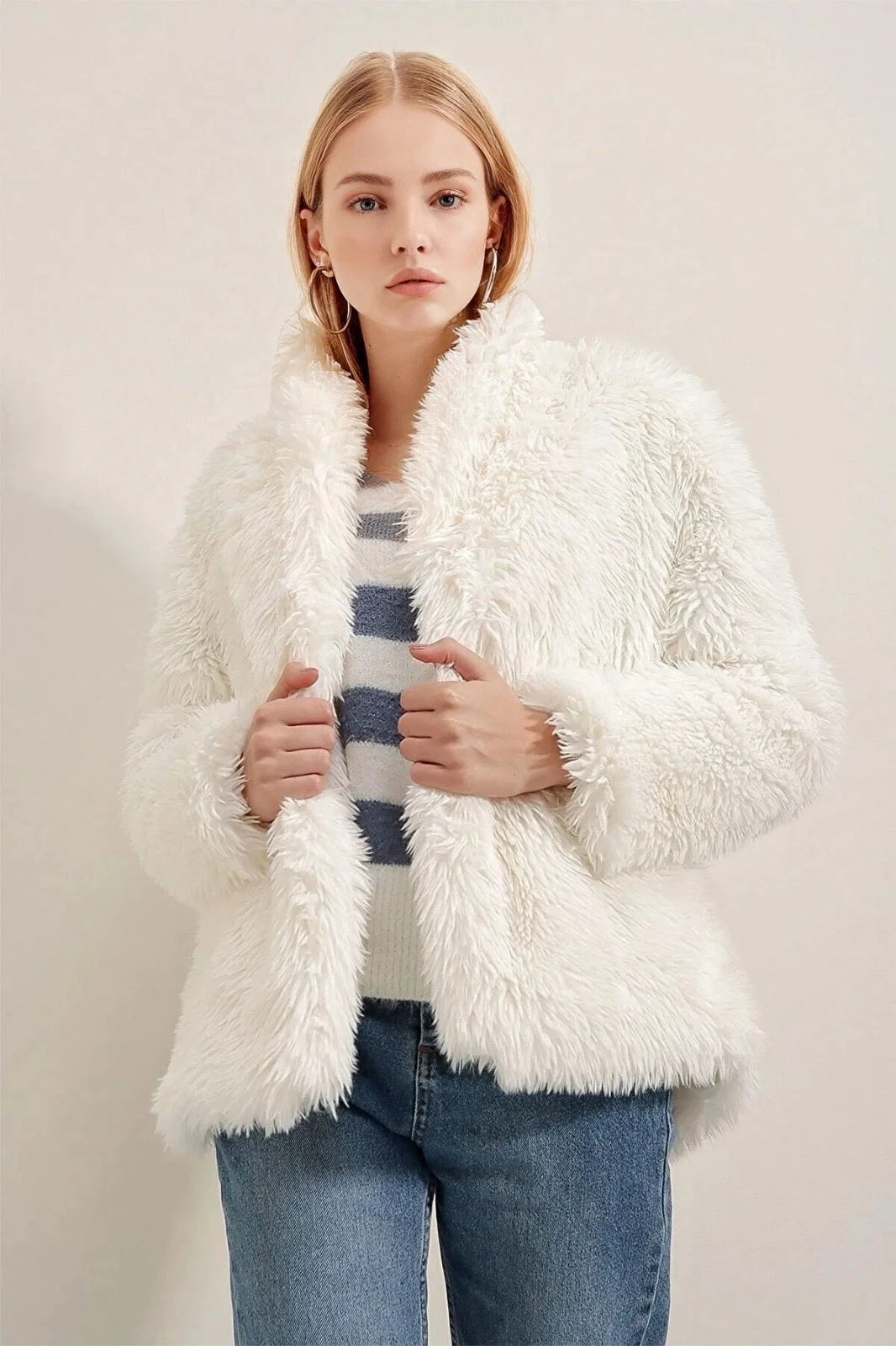 Женская белая стильная подкладка из искусственного меха куртка HZL23W-BD190881, 100% полиэстер, размер 36-44, длина 70 см, без карманов, с одним крючком