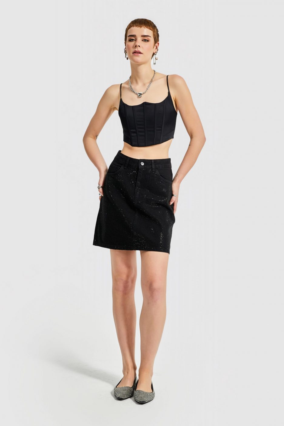 Женская черная джинсовая юбка с блестящими камнями, прямая, 100% хлопок, стандартная длина для всех размеров, размер 34-38