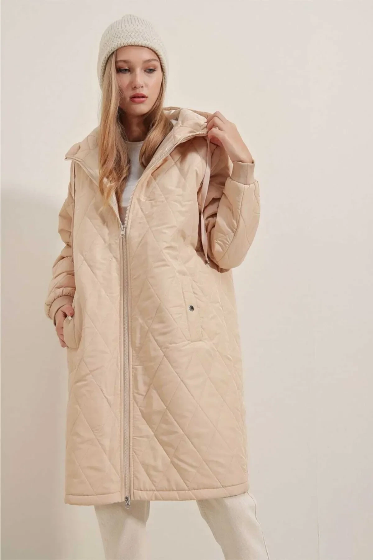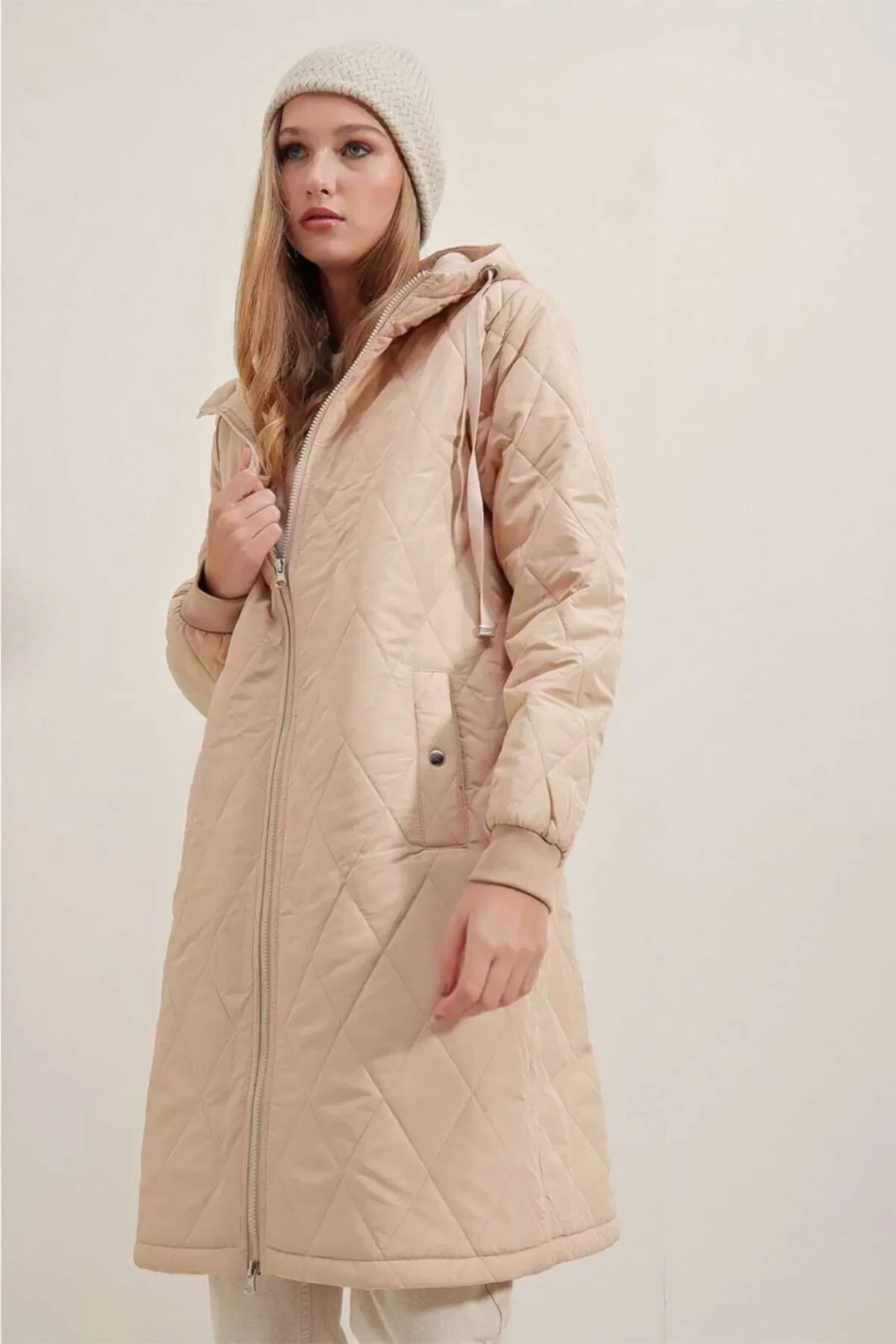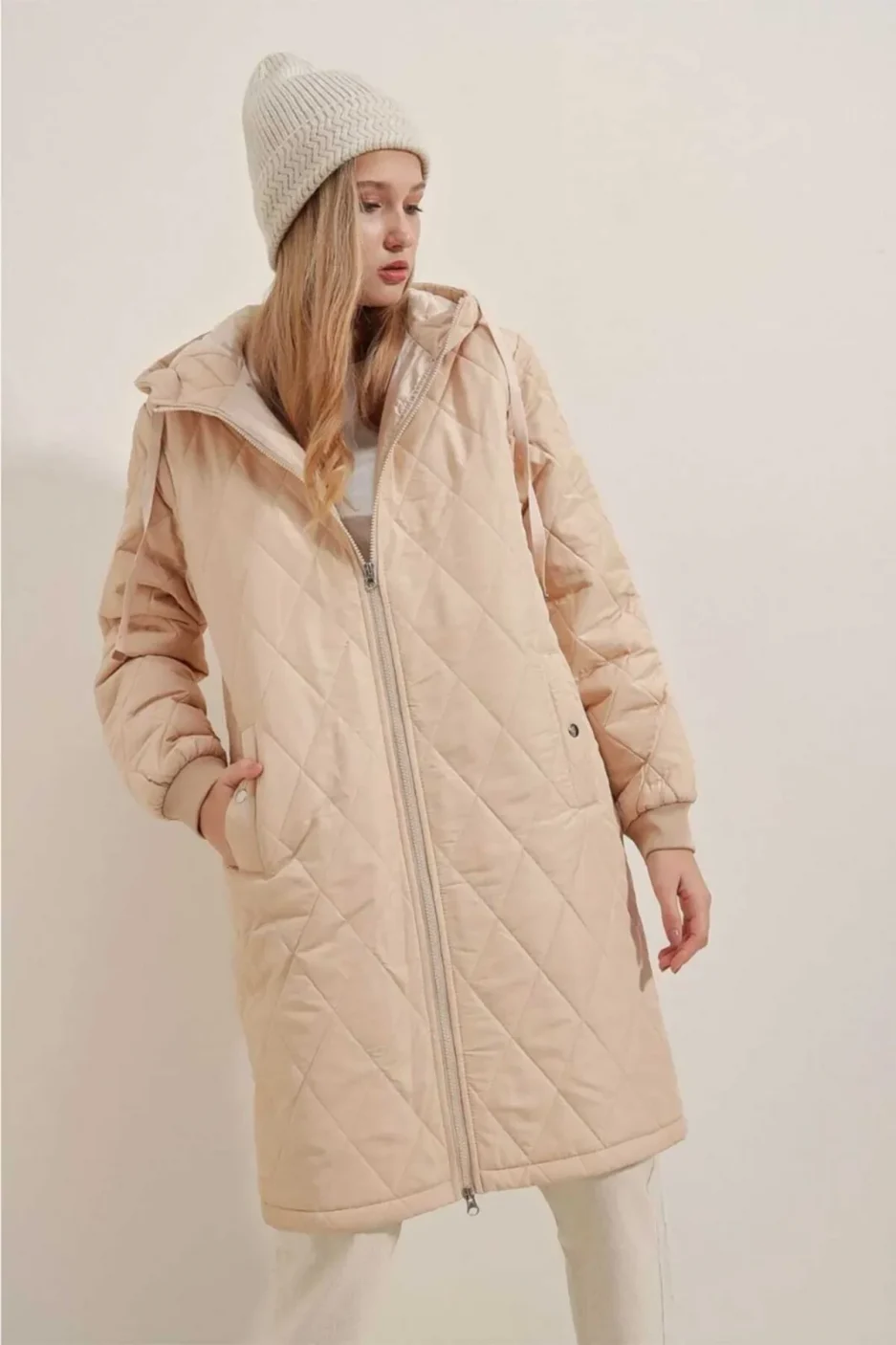Женская кремовая стеганая длинная пуховка HZL22W-BD151381, 100% Polyester, размер M/38, капюшон несъемный, карманы, производство Турция