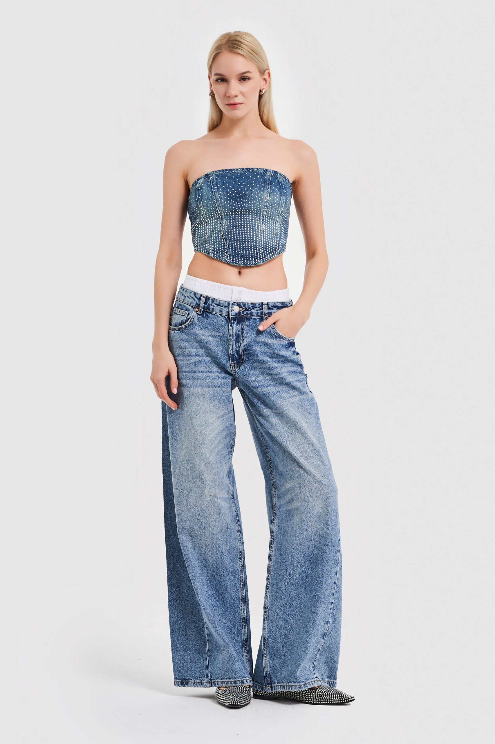 Женские джинсы палаззо с деталями бокса, цвет — тонкий джинс, 100% хлопок, стандартная длина для всех размеров