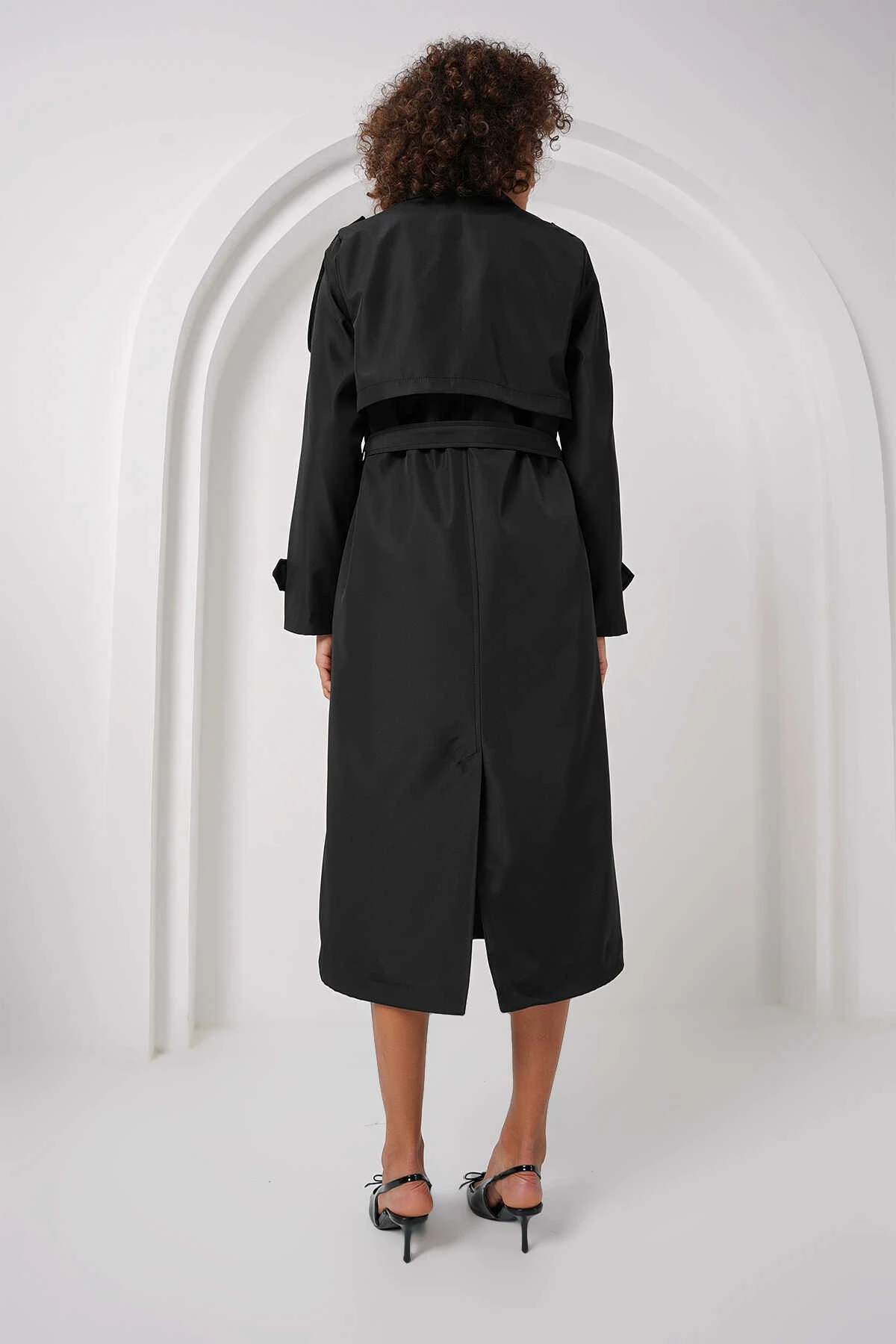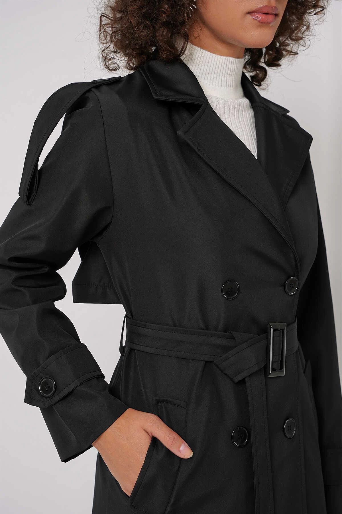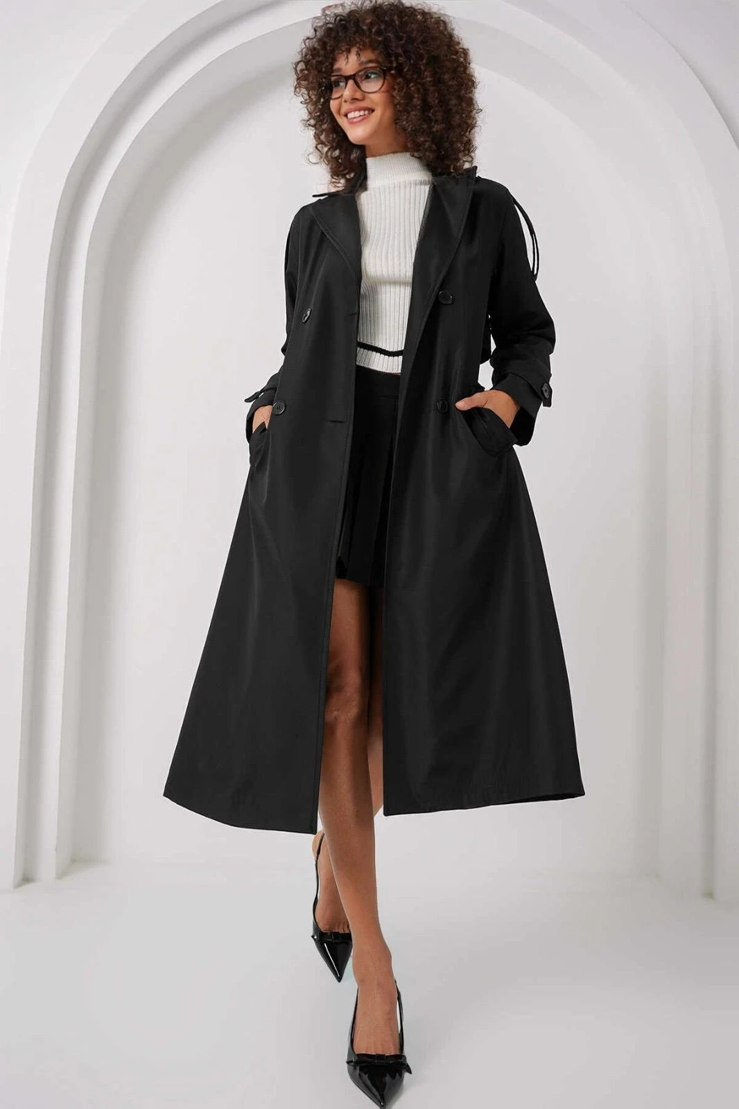 Женский черный тренч с капюшоном, подкладкой и поясом, сезонный, 100% полиэстер, размеры 34-44, длина 118 см, производство Турция
