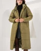 Женский темно-зеленый капюшонный длинный оверсайз пуховик, двойная застежка, с подкладкой, 100% полиэстер, рекомендуемый на размер меньше